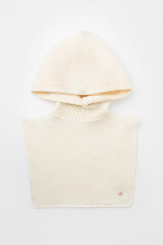 Теплый вязаный капор с глубоким капюшоном из шерсти и акрила. Шерсть в составе хорошо удерживает тепло, а волокна акрила делают изделие мягким и предотвращают деформацию и появление катышек. Лаконичный крой хорошо сочетается с верхней одеждой.