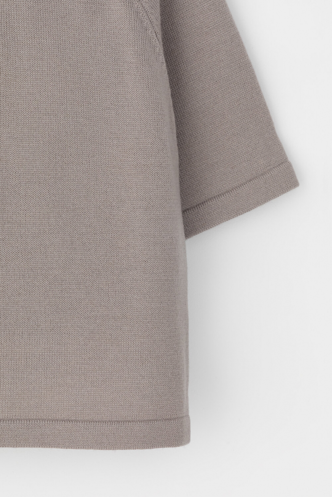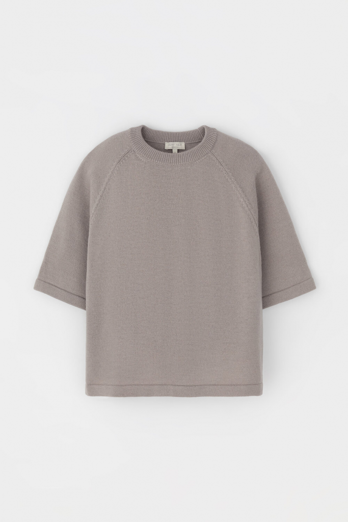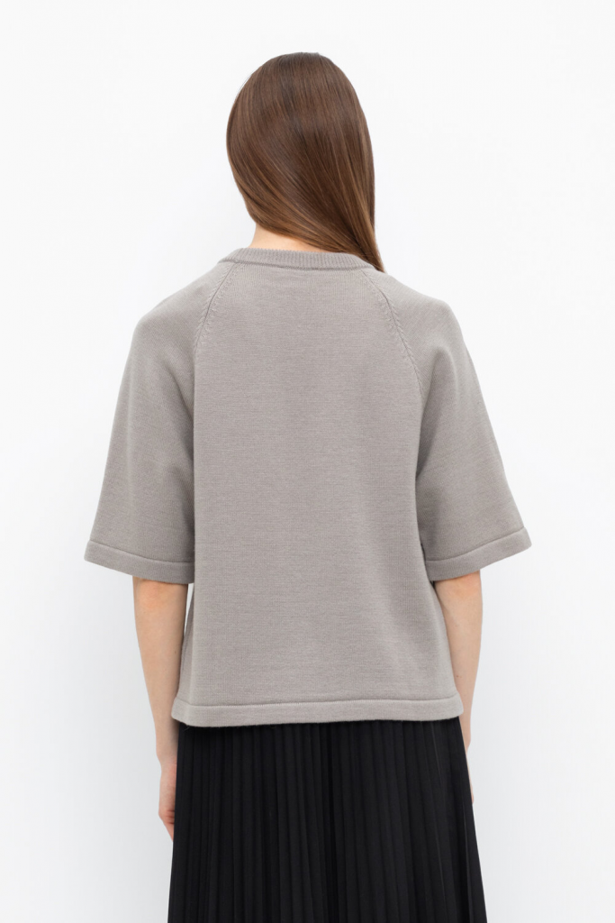 Джемпер в стиле прямой футболки стандартной длины с короткими рукавами-реглан. Выполнен гладью. Средняя плотность вязания и пластичная фактура сохраняют форму изделия.