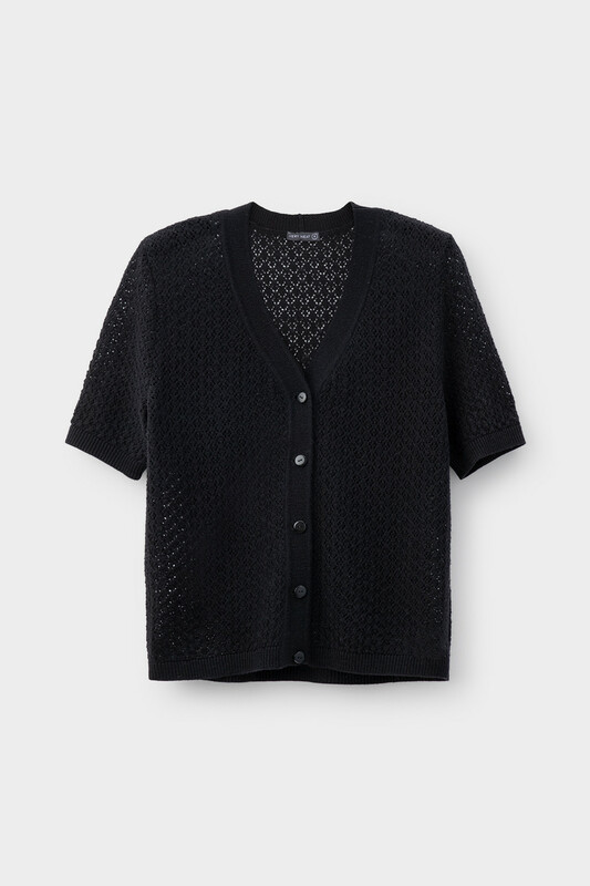 Вязаный ажурный кардиган с короткими рукавами на пуговицах из шерсти с добавлением акрила. Манжеты и нижний край не растянутся благодаря вывязанной резинке.Выполнен из мягкой полушерстяной пряжи. Шерсть в составе сохраняет тепло, акрил делает изделие мягким. Все вязаные изделия проходят дополнительную влажно-тепловую обработку по итальянской технологии, что гарантирует минимальную усадку во время носки. Сделано в России.