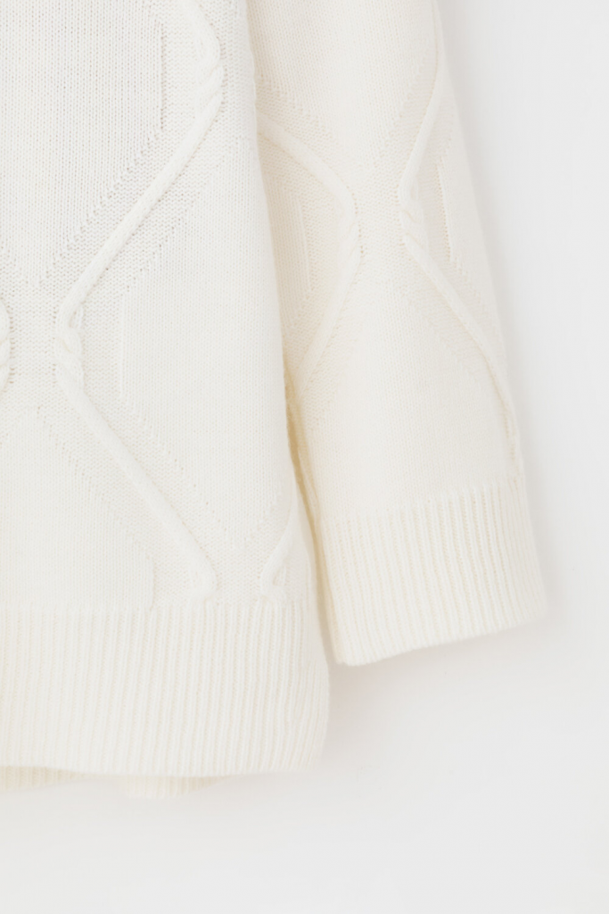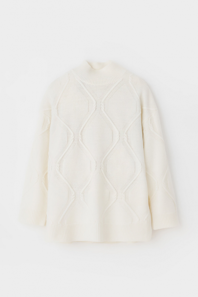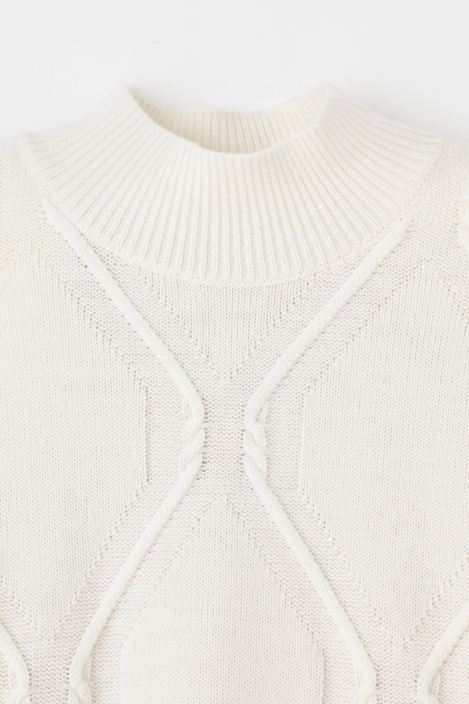 Уютный вязаный джемпер с красивым вывязанным узором и воротником-стойкой из полушерстяной пряжи. Шерсть мериноса в составе сохраняет тепло, а волокна акрила добавляют мягкость и объем. Комфортная посадка и спущенные плечи придают изделию объем.