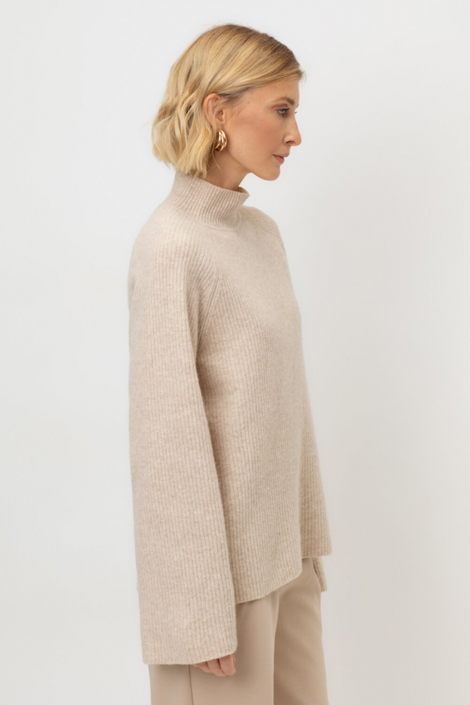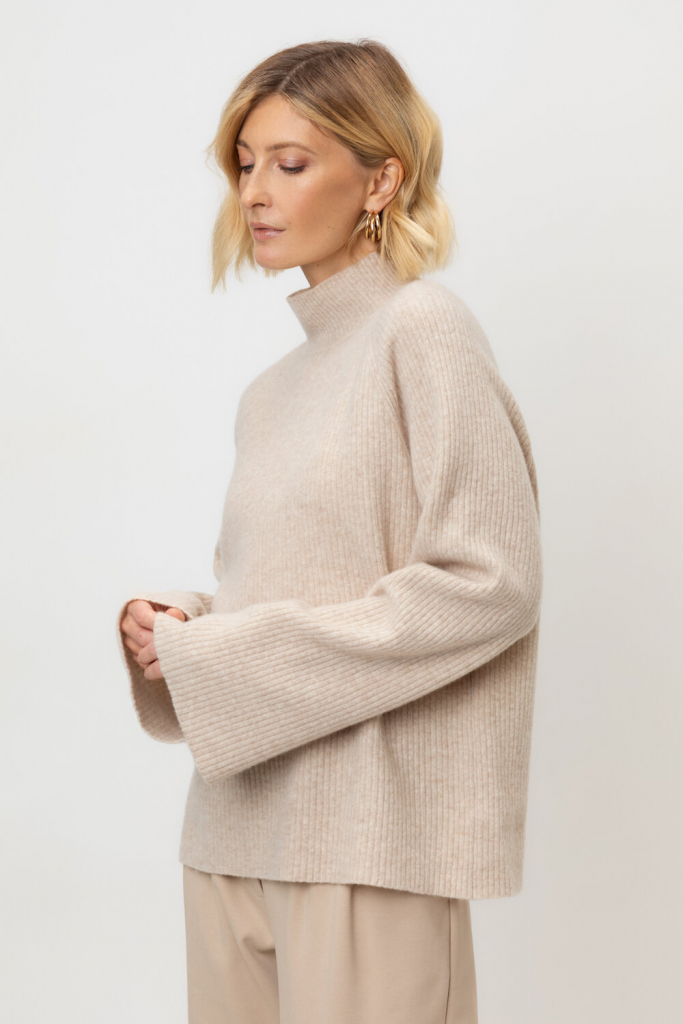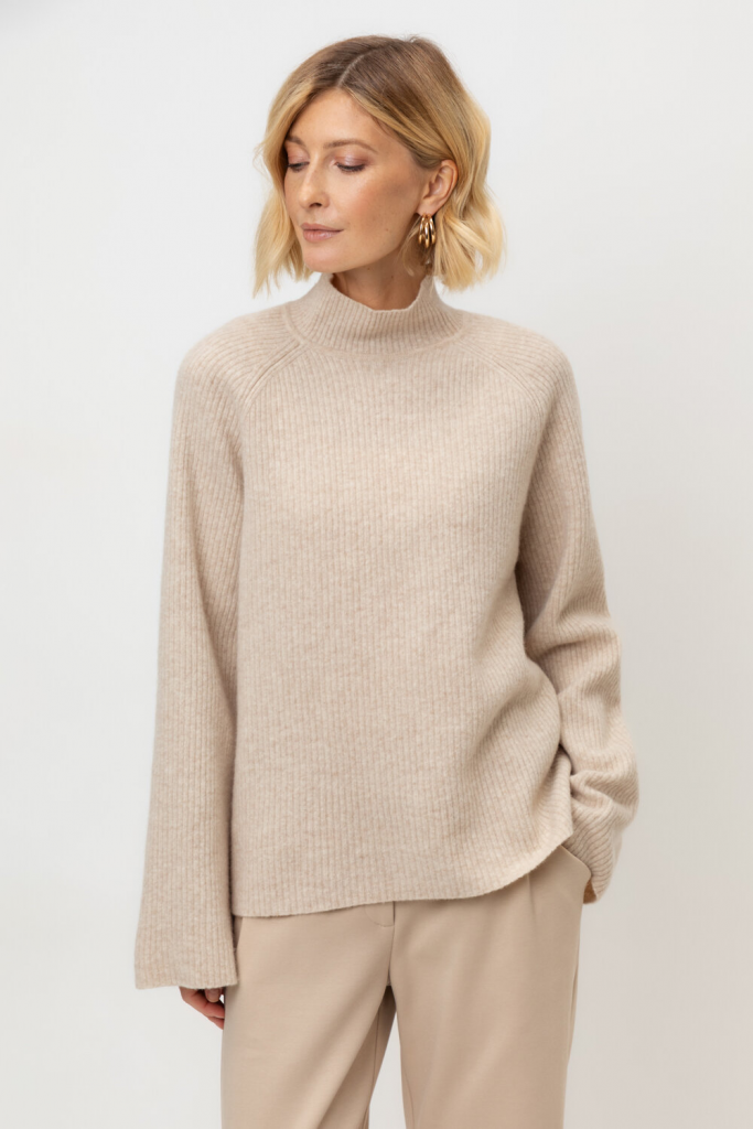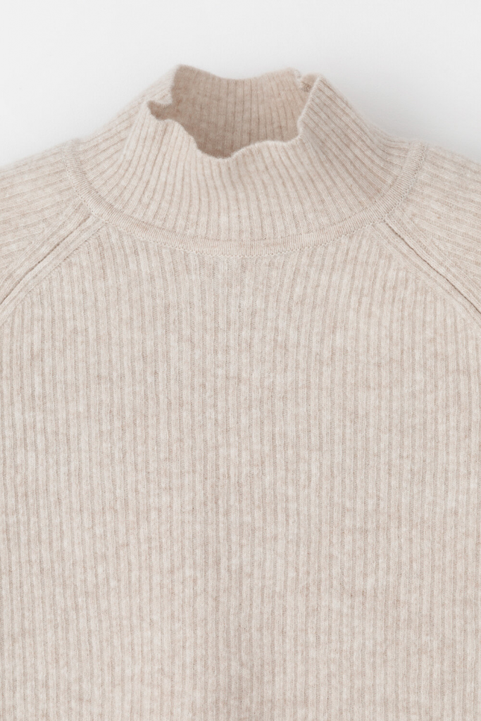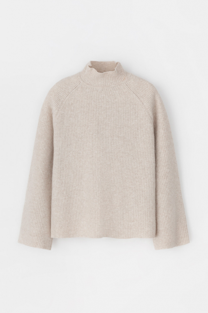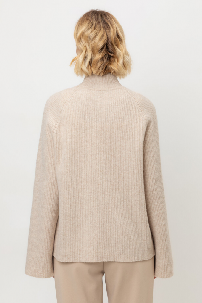 Джемпер из премиальной итальянской шерсти с рукавами-реглан в тонкий рубчик, рукава связаны ластиком 2*2. Средняя плотность вязания и пластичная фактура сохраняют форму изделия.