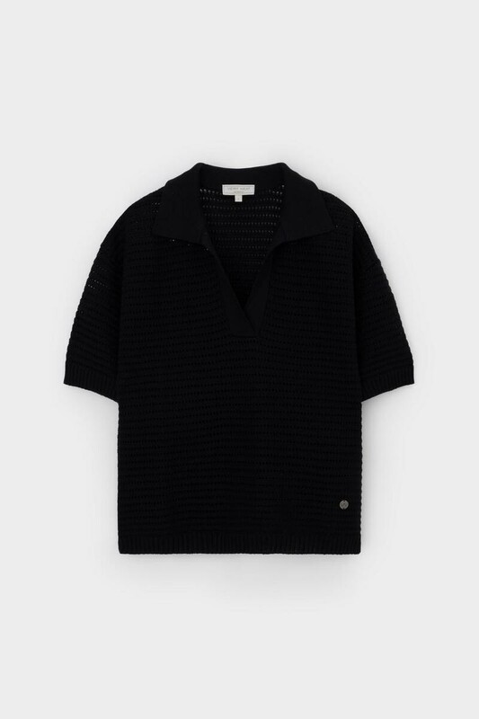Воздушное поло ажурной вязки из итальянского хлопка. Мягкий воротник без застежки в стиле поло и спущенная линия плеча добавляет легкости при создании летних образов.