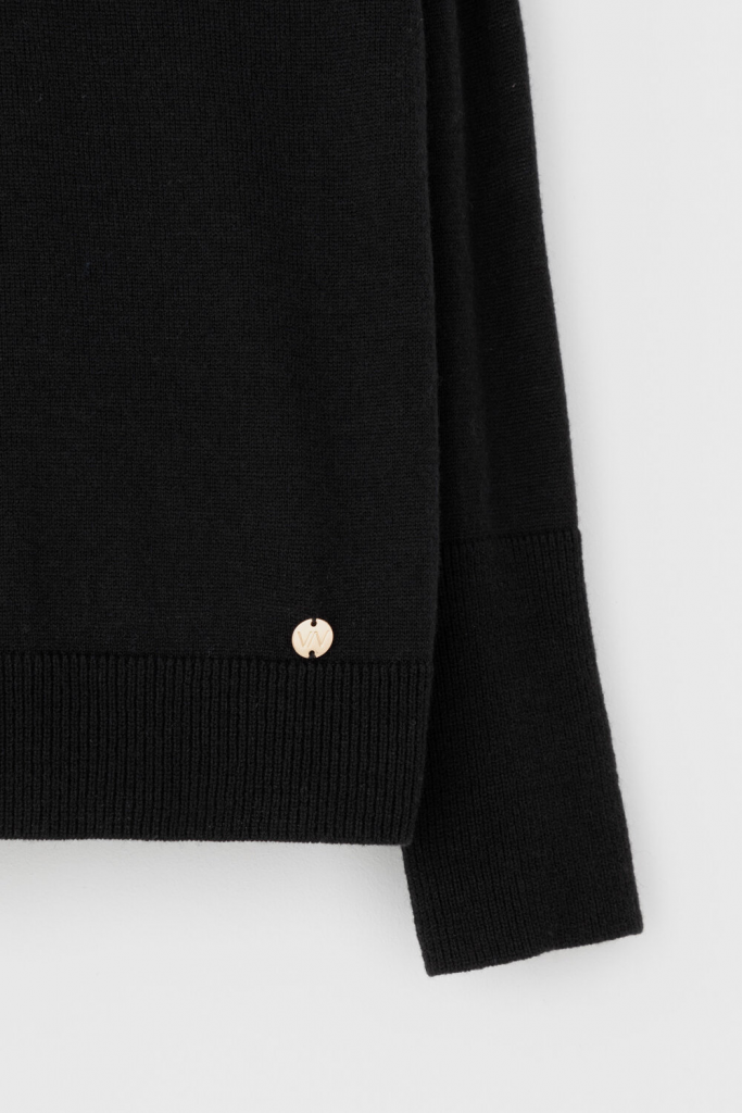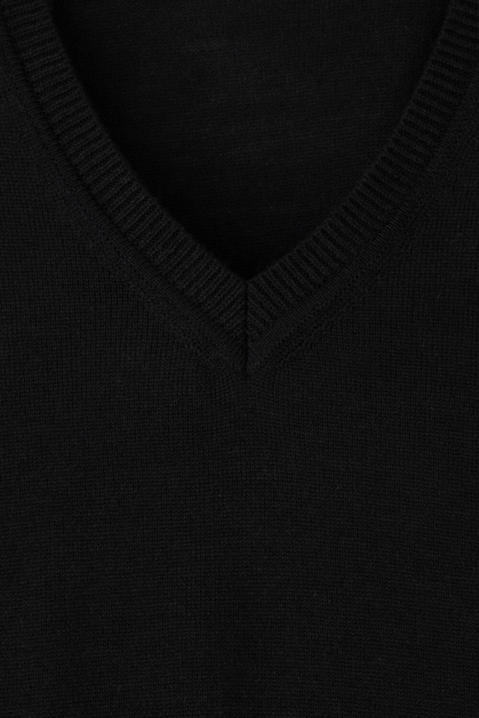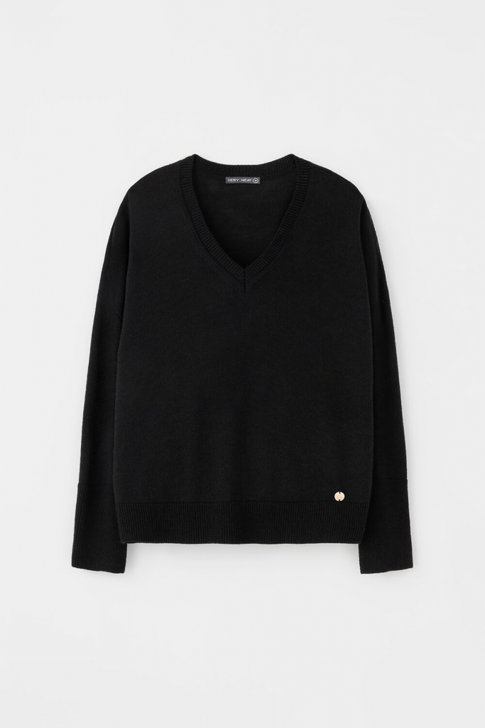 Уютный джемпер с V-образным вырезом. Выполнен гладью, манжеты, воротник и низ изделия связаны ластиком. В составе полушерстяная пряжа. Шерсть в составе приятно согревает, а благодаря волокнам акрила изделие мягкое и дольше сохраняет форму.