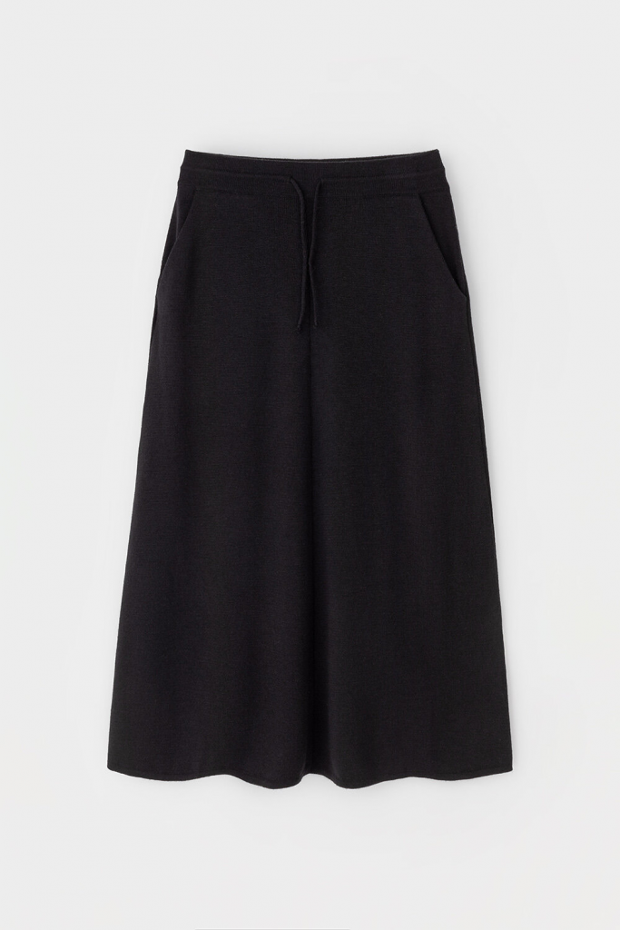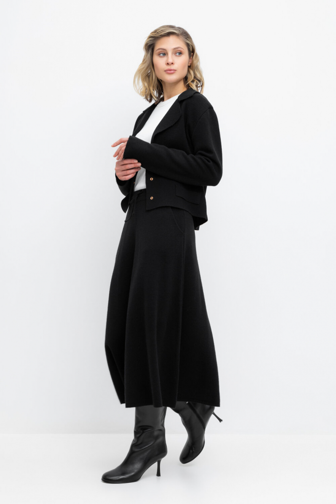 Юбка вязаная из полушерстяной пряжи. Шерсть мериноса в составе сохраняет тепло, а акрил делает изделие мягким и объемным. Пояс на резинке, регулируется вязаным шнурком в тон юбки.