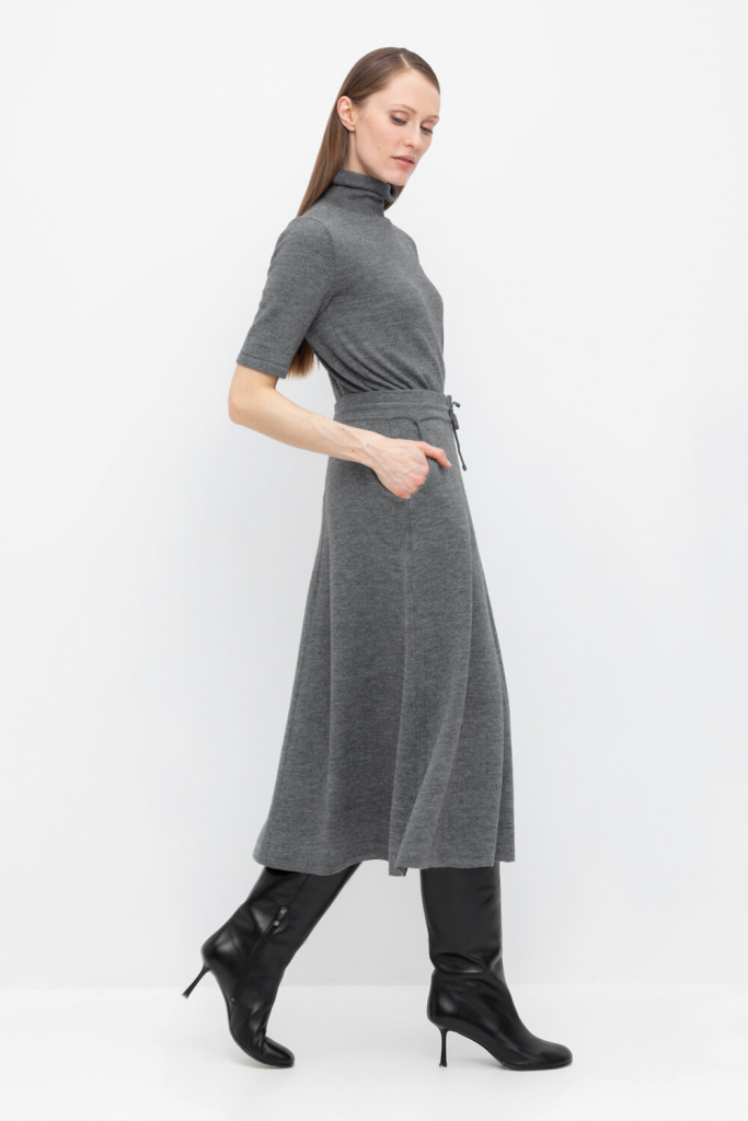 Юбка вязаная из полушерстяной пряжи. Шерсть в составе сохраняет тепло, а акрил делает изделие мягким и объемным. Пояс на резинке, регулируется вязаным шнурком в тон юбки.