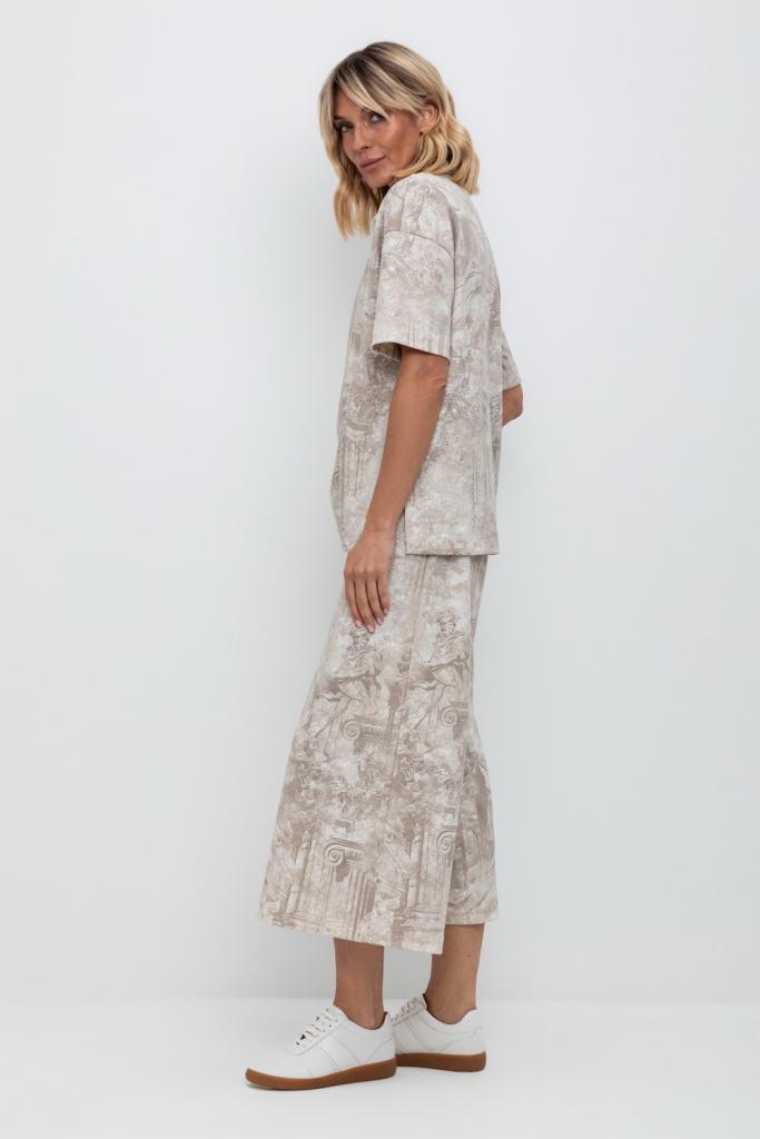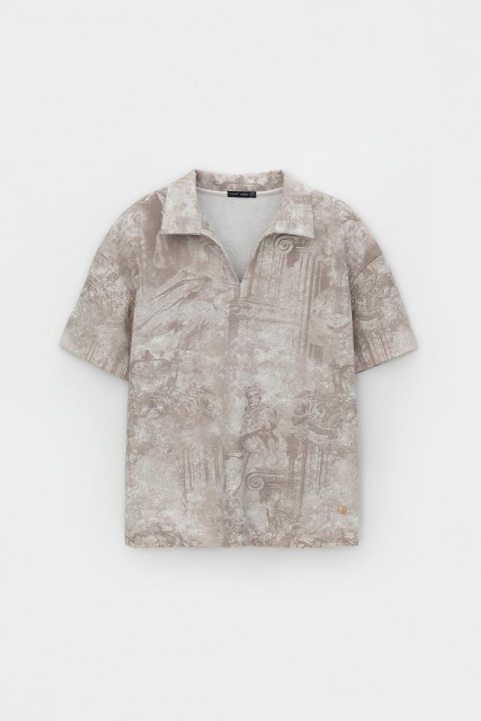 Джемпер поло с короткими рукавами из плотного набивного трикотажа интерлок с V-образным вырезом. Спущенное плечо придает изделию свободный силуэт.