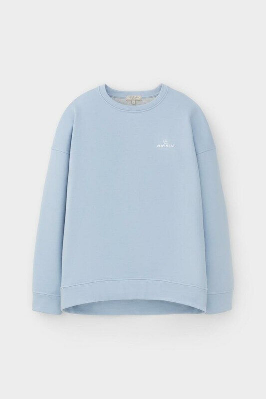 Объемный свитшот из двухцветного трикотажного футера. Внутренняя сторона изделия представлена в натуральном цвете хлопка, внешняя в нежно-голубом. За счет использования крашенной пряжи, данный вид полотна прошел минимальную обработку, что придало изделию мягкость и шелковистость.