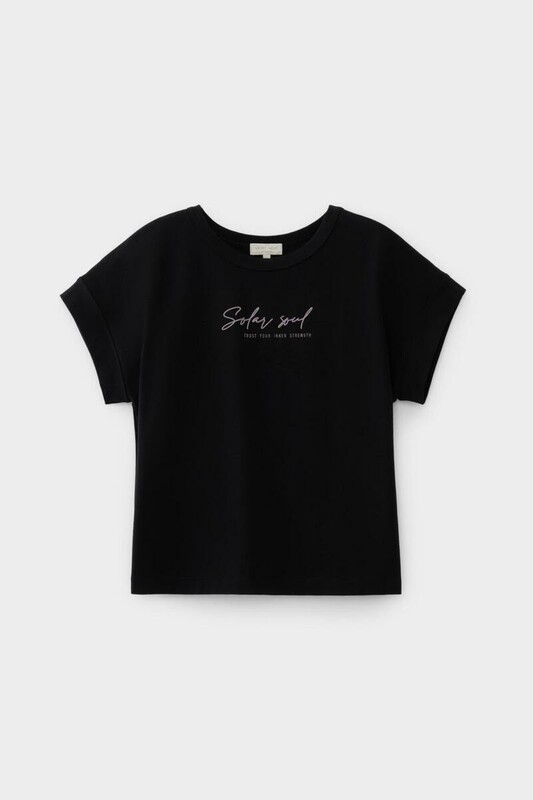 Футболка прямого силуэта из высококачественного гребенного хлопка с добавлением эластана. Мягкая и струящаяся фактура полотна за счет специальной обработки soft touch дает ощущение комфорта в жаркие летние дни. Мягкий на ощупь принт выполнен из водных красок, что обеспечивает устойчивость к многократным стиркам.