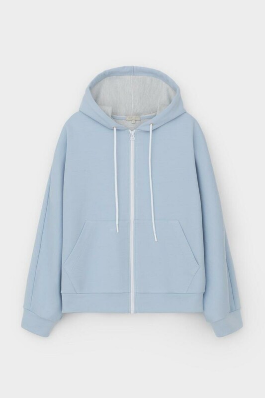 Объемная толстовка из двухцветного трикотажного футера. Внутренняя сторона изделия представлена в натуральном цвете хлопка, внешняя в нежно-голубом. За счет использования крашенной пряжи данный вид полотна прошел минимальную обработку, что придало изделию мягкость и шелковистость.