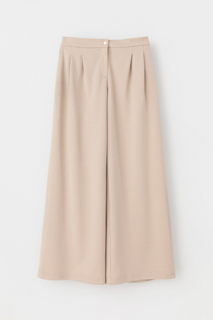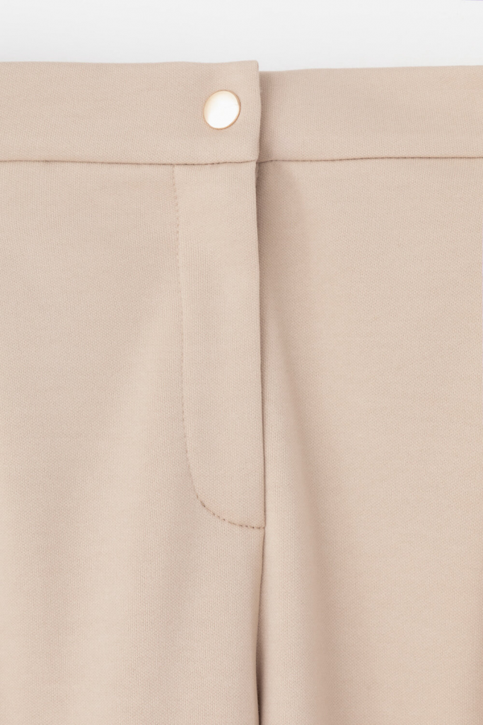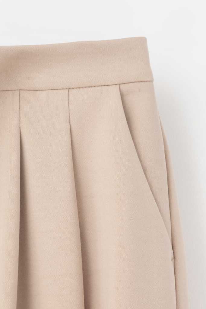 Свободные женские брюки со складками и боковыми карманами из плотного гладкого трикотажа интерлок. Застегиваются на молнию и кнопку. Низ обработан плоскими швами.