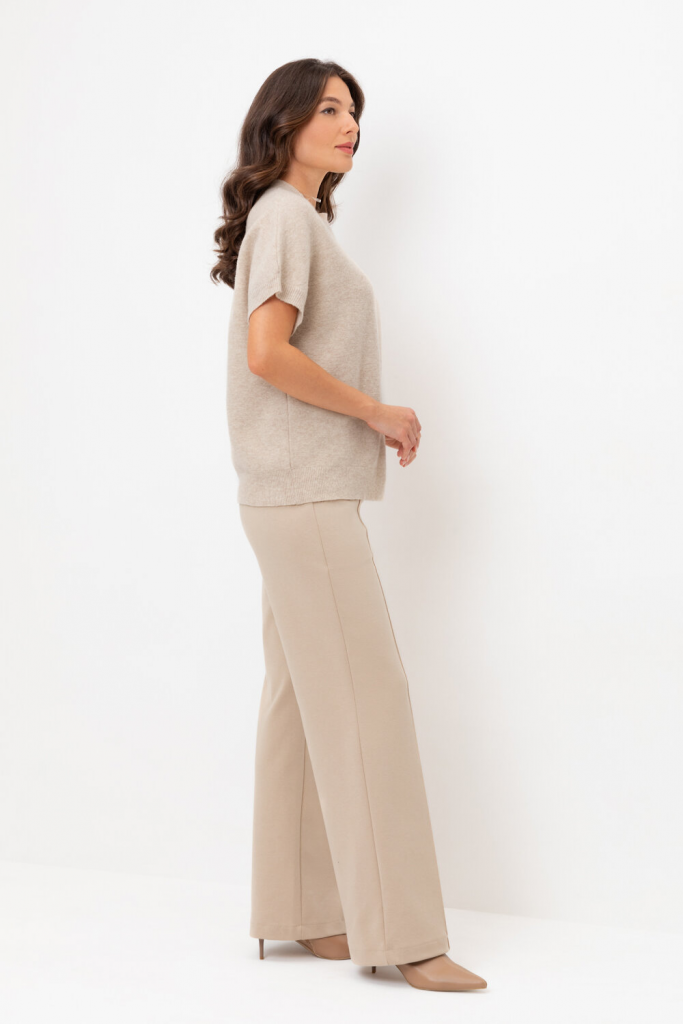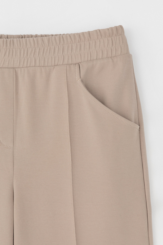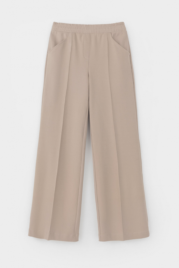 Брюки прямого кроя со стрелкой и боковыми карманами из плотного гладкого трикотажа интерлок. Пояс на резинке обеспечивает комфортную посадку.