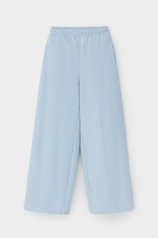 Брюки свободного силуэта со стрелками из мягкого двухцветного футера. Внутренняя сторона изделия представлена в натуральном цвете хлопка, внешняя в нежно-голубом. За счет использования крашенной пряжи, данный вид полотна прошел минимальную обработку, что придало изделию мягкость и шелковистость.