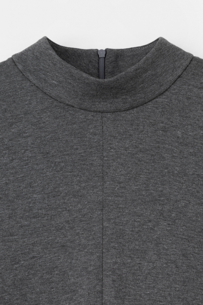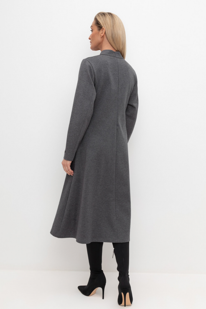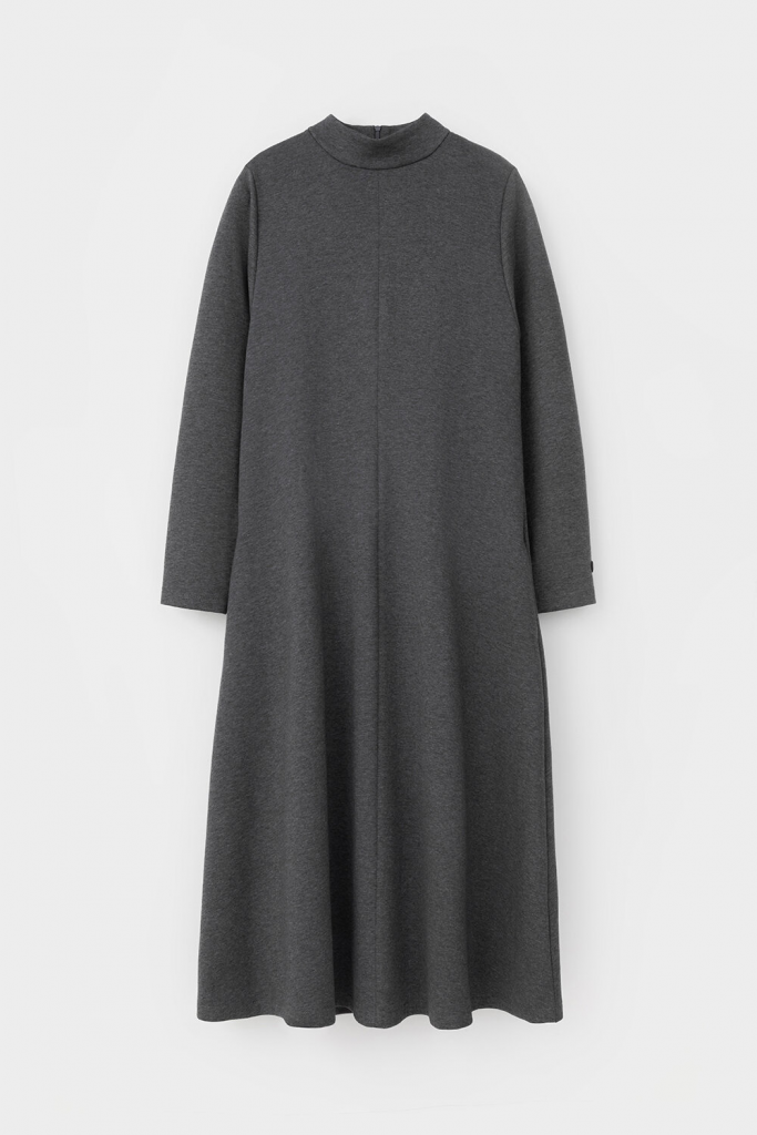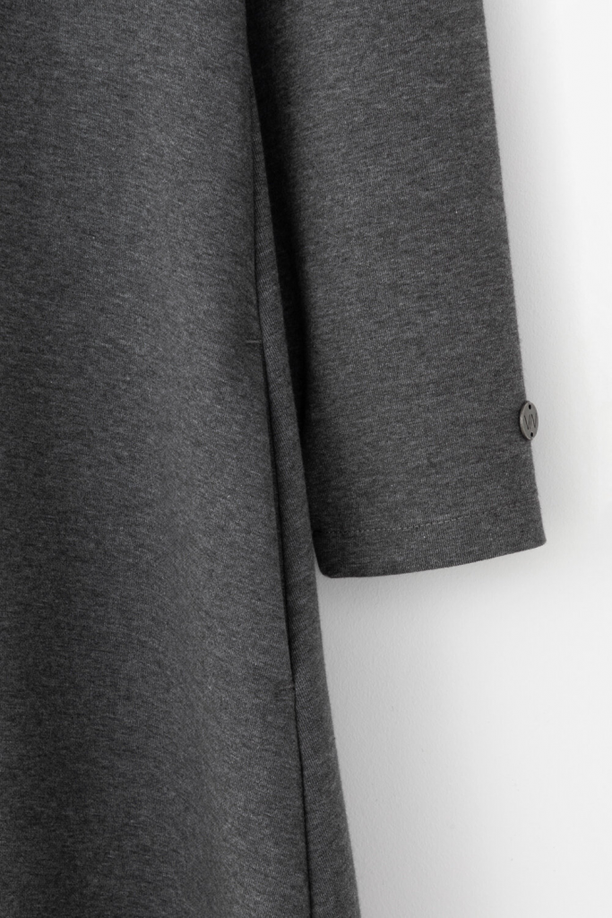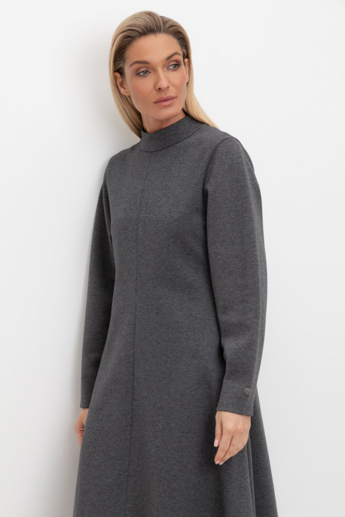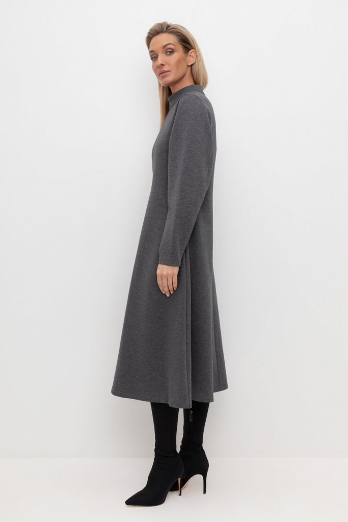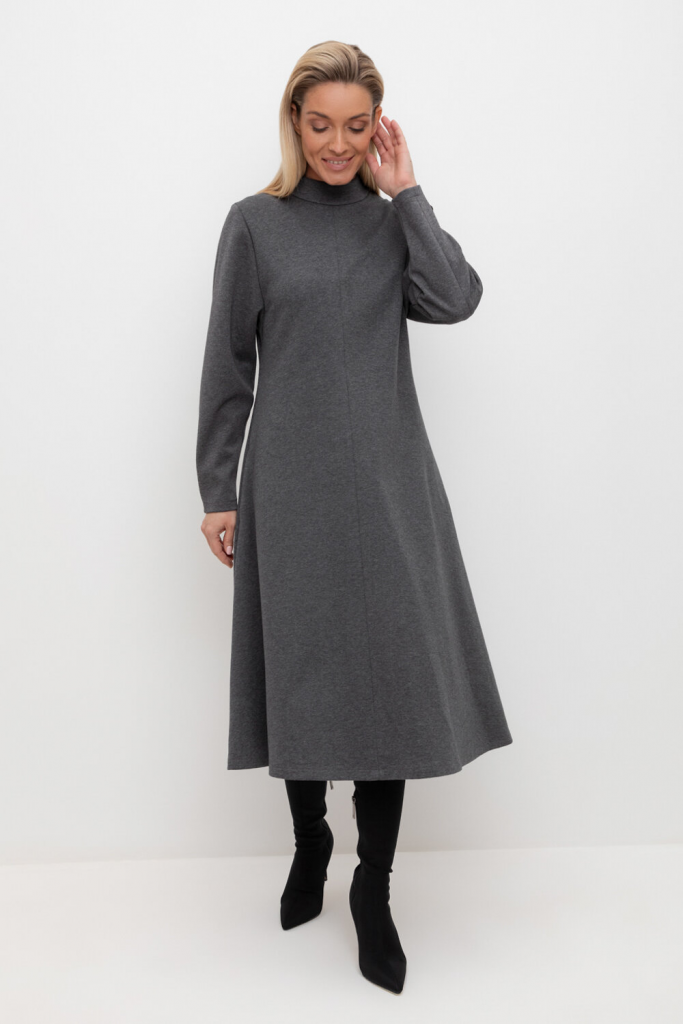 Платье с воротником-стойкой и длинными рукавами из плотного трикотажа интерлок. В боковых швах карманы.