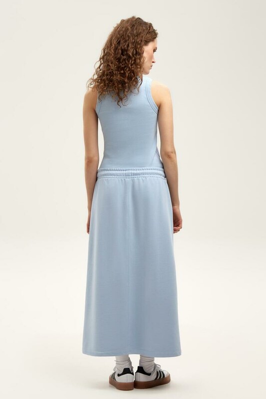 Юбка спортивного силуэта из мягкого двухцветного футера. Внутренняя сторона изделия представлена в натуральном цвете хлопка, внешняя в нежно-розовом. За счет использования крашенной пряжи, данный вид полотна прошел минимальную обработку, что придало изделию мягкость и шелковистость.