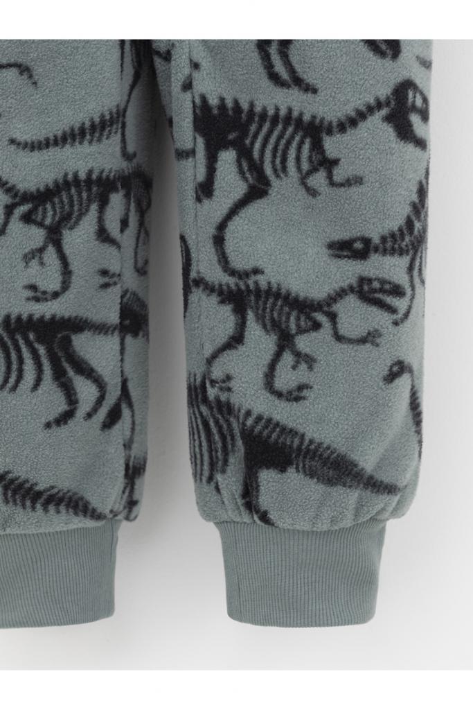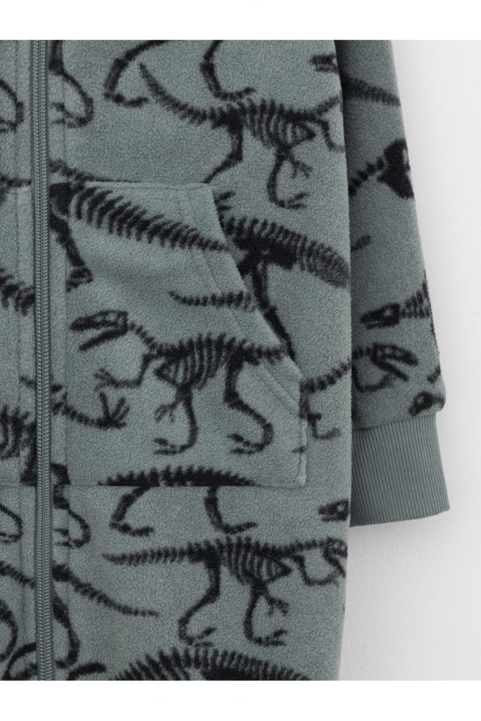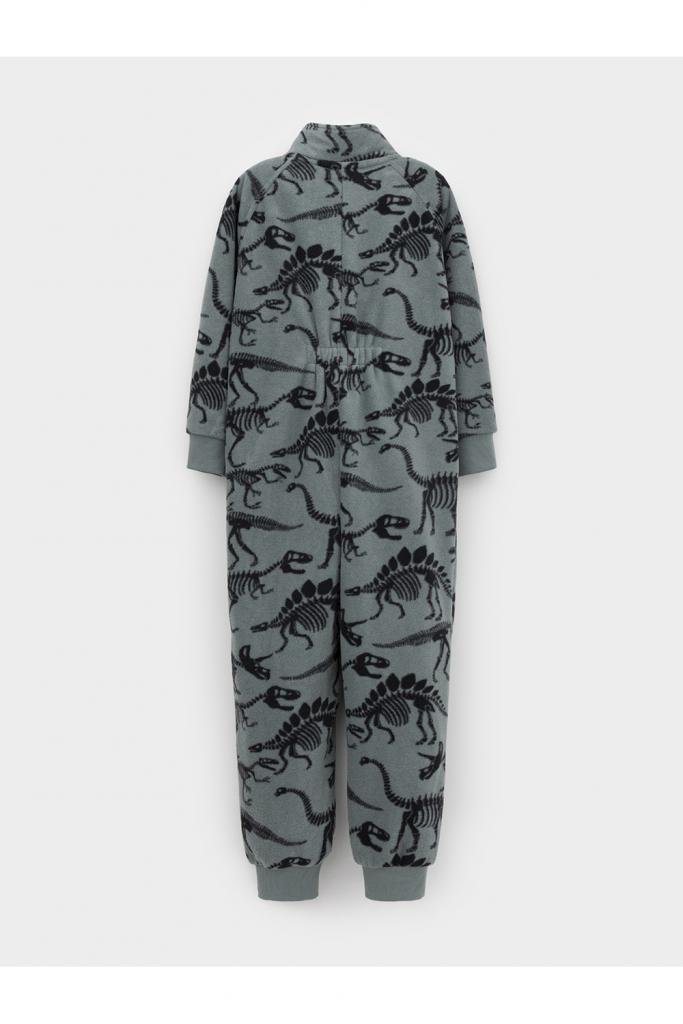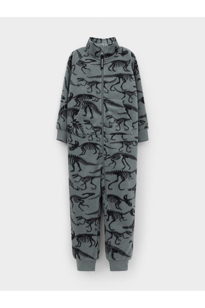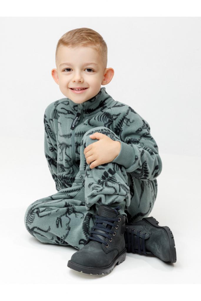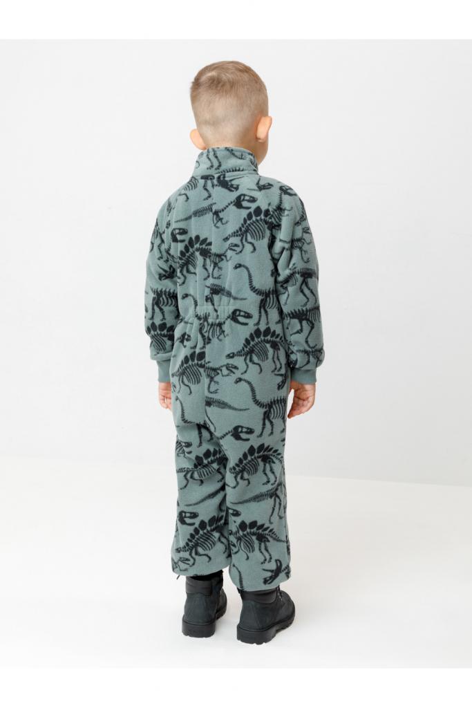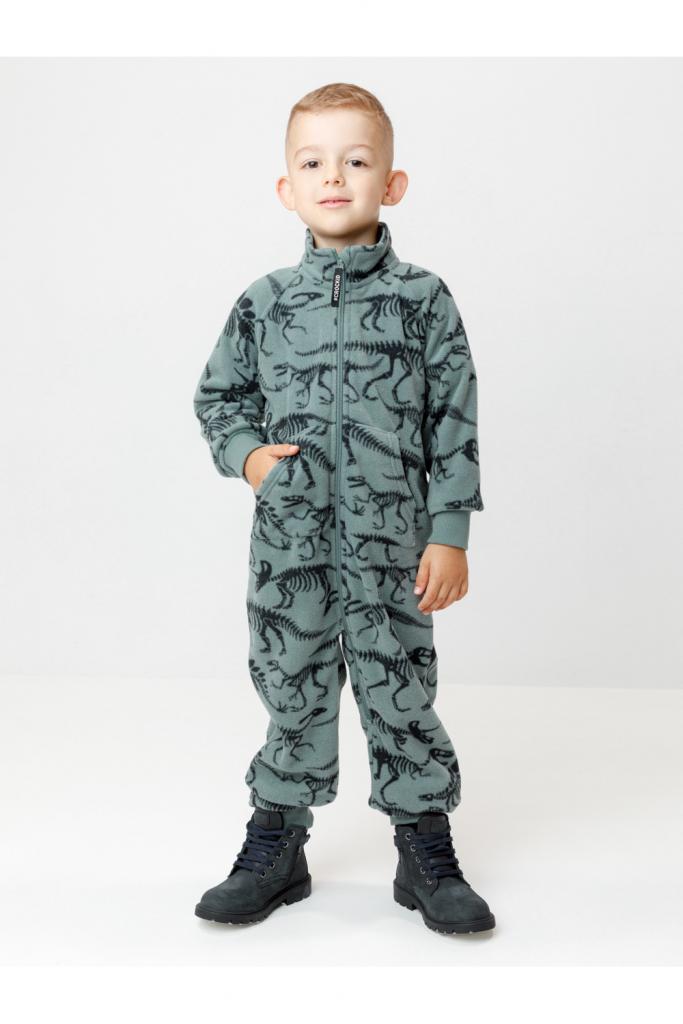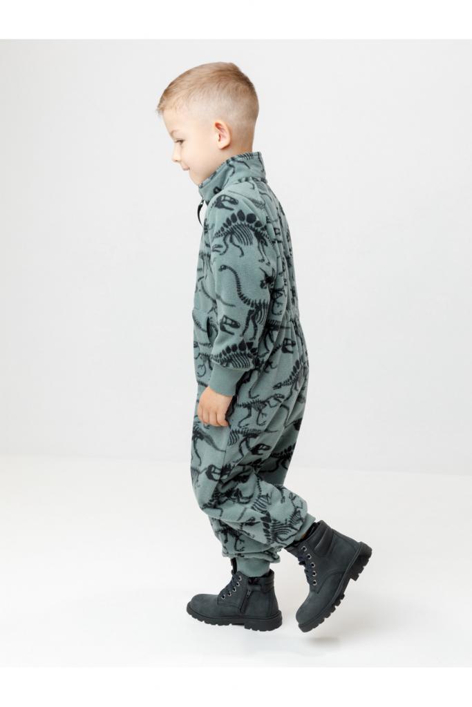 Флисовый комбинезон для мальчика с высоким воротником. Застёгивается на удлинённую молнию с мягкой защитой шеи и подбородка. Рукава и низ изделия на манжетах из трикотажа в рубчик. Эластичная резинка по спинке обеспечивает идеальную посадку. Спереди удобный карман-кенгуру. Оригинальная набивка выполнена из стойких гипоаллергенных текстильных красителей. Комбинезон сохраняет цвет и форму после многократных стирок.
