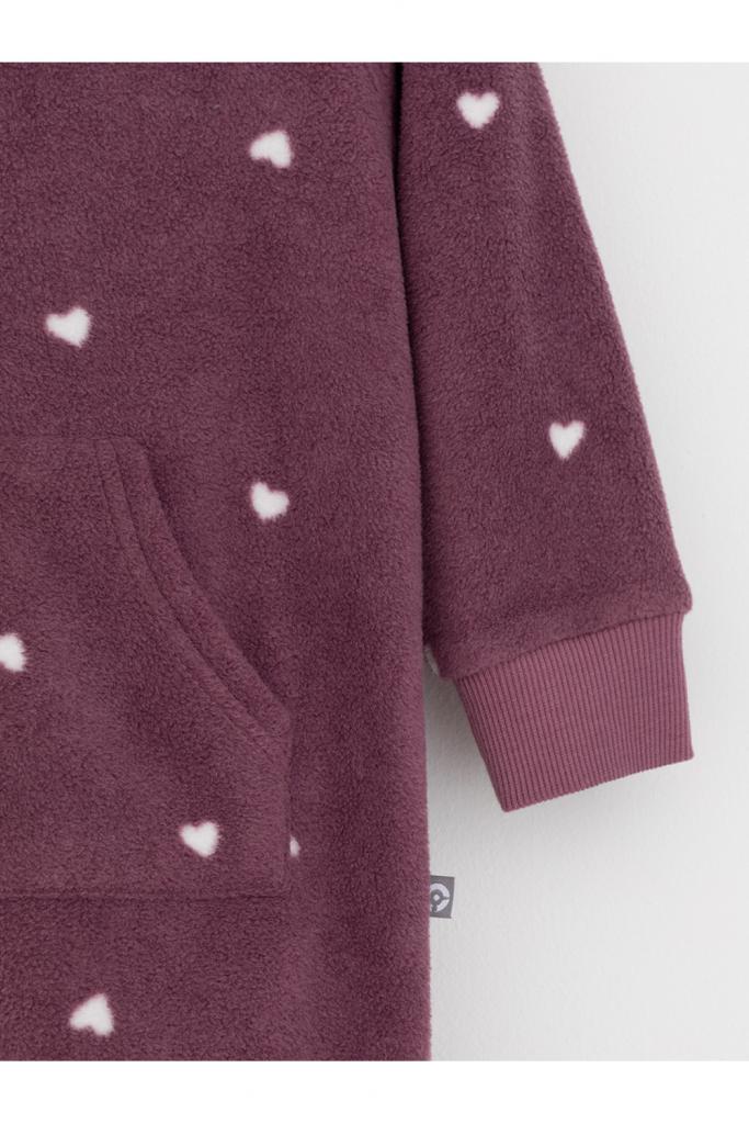 Флисовый комбинезон для девочки с высоким воротником. Застёгивается на удлинённую молнию с мягкой защитой шеи и подбородка. Рукава и низ изделия на манжетах из трикотажа в рубчик. Эластичная резинка по спинке обеспечивает идеальную посадку. Спереди удобный карман-кенгуру. Оригинальная набивка выполнена из стойких гипоаллергенных текстильных красителей. Комбинезон сохраняет цвет и форму после многократных стирок.