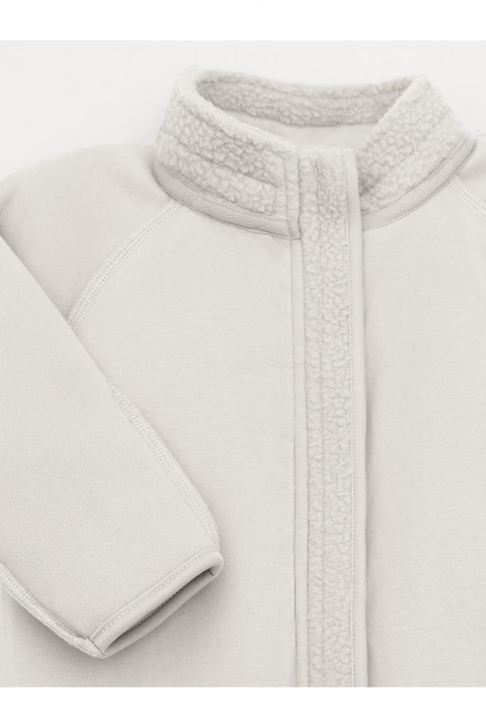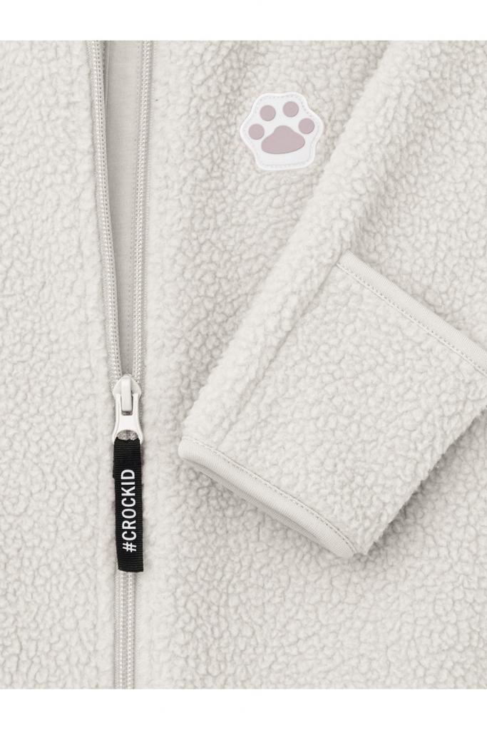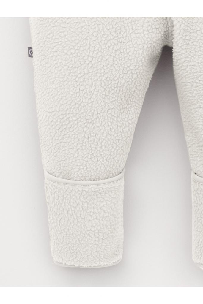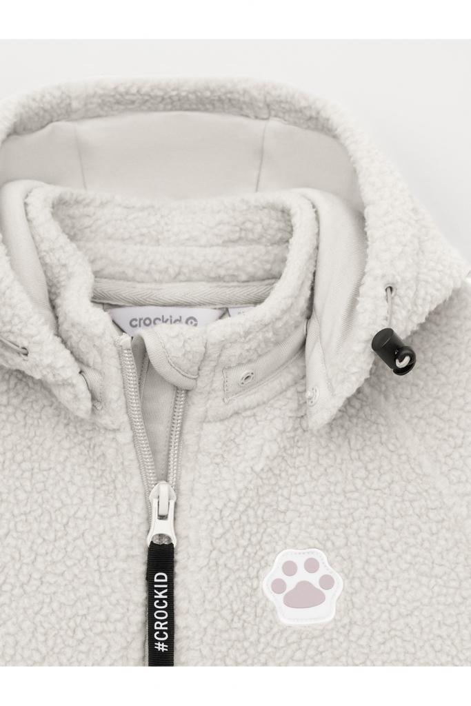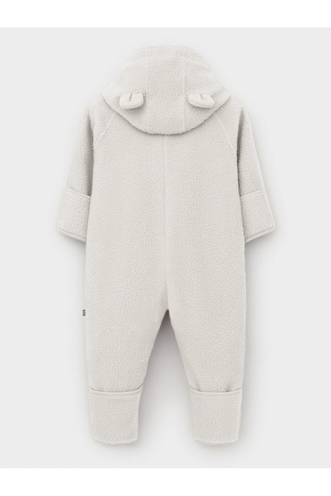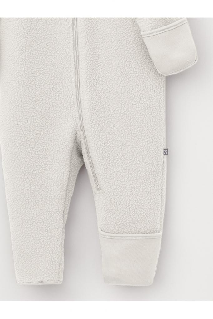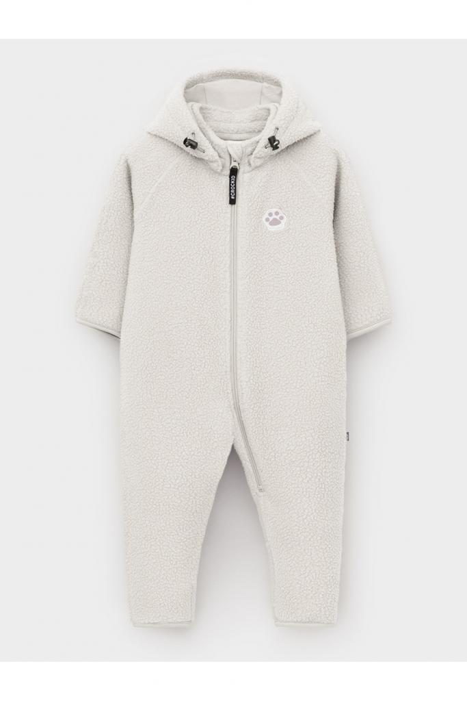 Флисовый комбинезон для девочки со съёмным капюшоном. Капюшон регулируется по ширине с помощью эластичной утяжки со стопперами. Подклад выполнен из гладкого трикотажа супрем, произведённого из высококачественного натурального хлопка. Застёгивается на удлинённую молнию с мягкой защитой шеи и подбородка. В размерах 62, 68 и 74 на рукавах и ножках есть отвороты. Украшен декоративными ушками и нашивкой. Комбинезон сохраняет цвет и форму после многократных стирок.