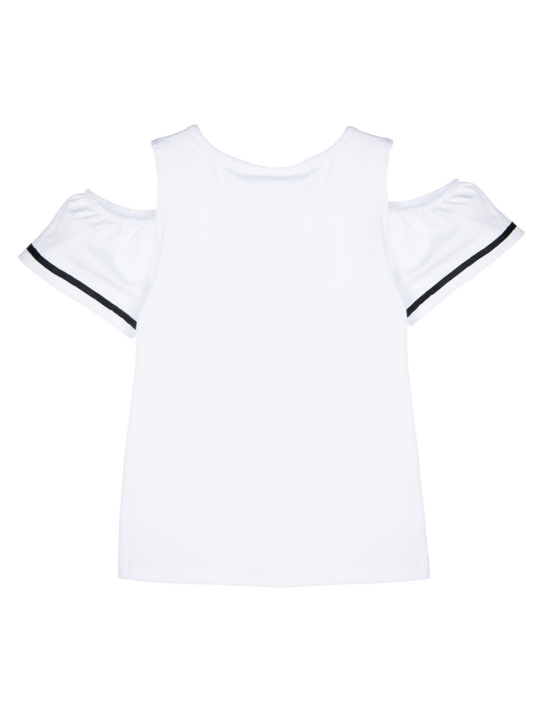 Футболка с открытыми плечами из качественного и приятного на ощупь трикотажа джерси. Высокое содержание хлопка 95%. Благодаря наличию эластана в составе ткани изделие проще в уходе и держит форму. Regular fit.