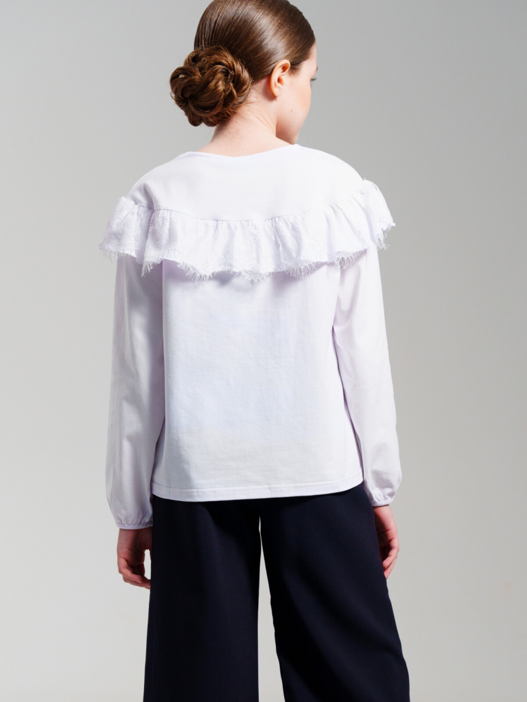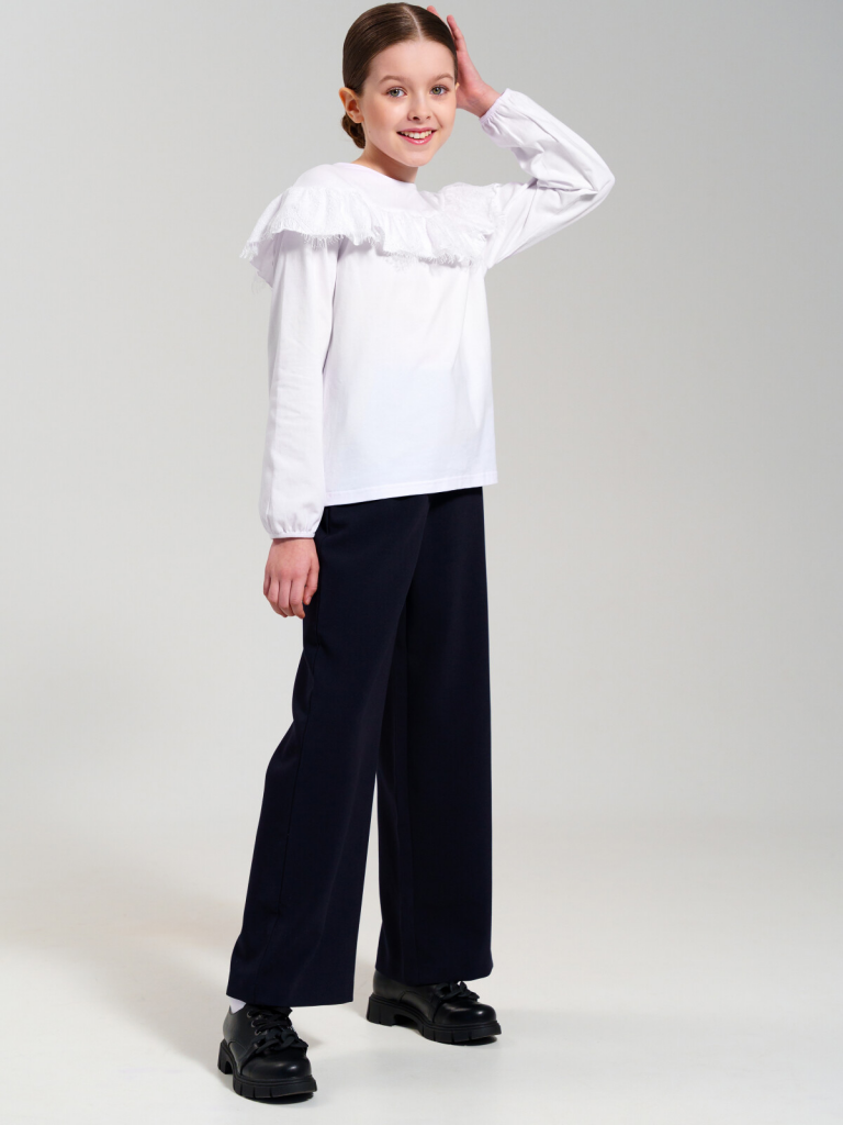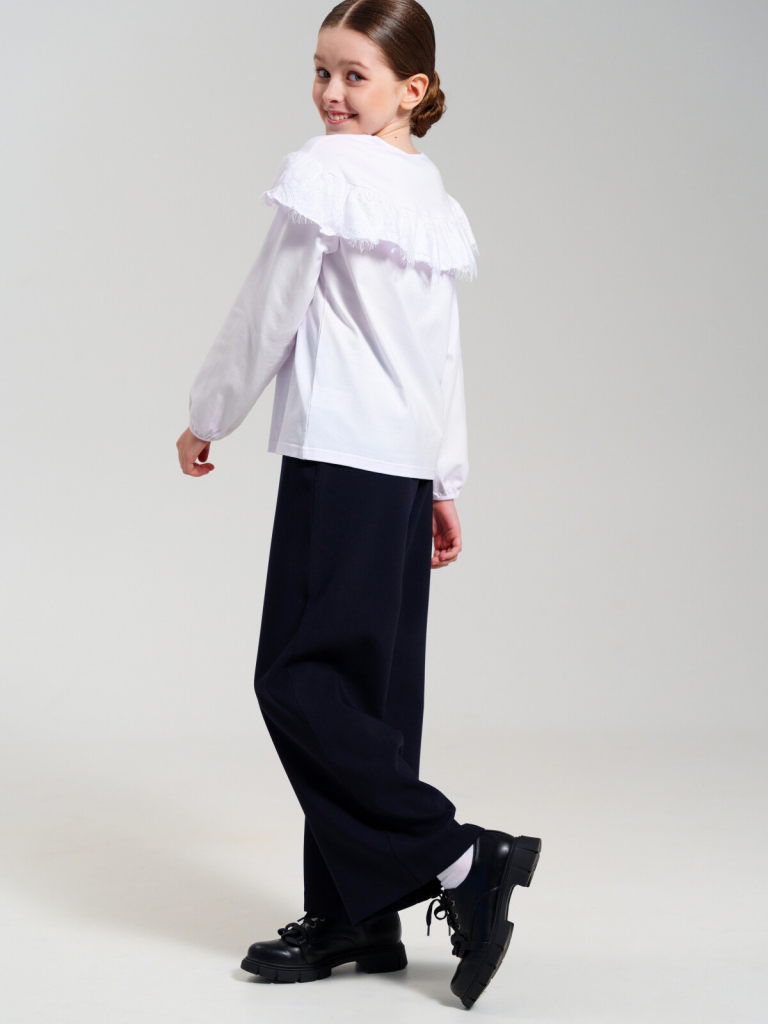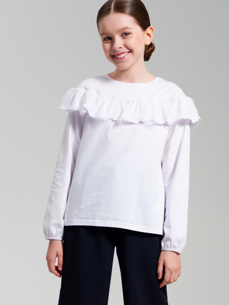 Белая трикотажная блузка прямого силуэта для девочки подростка - прекрасная альтернатива текстильной блузке или рубашке. Школьная блузка очень мягкая и приятная на ощупь, блузка хорошо держит форму, комфортна в носке и проста уходе. Высокое содержание хлопка 95%. Блузка в школу с длинным рукавом разнообразит повседневные образы школьницы.