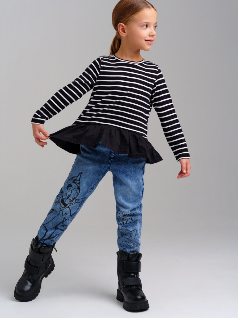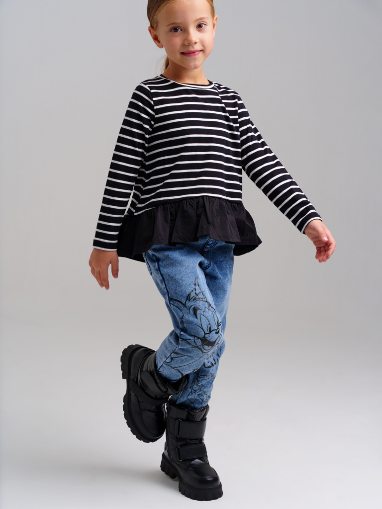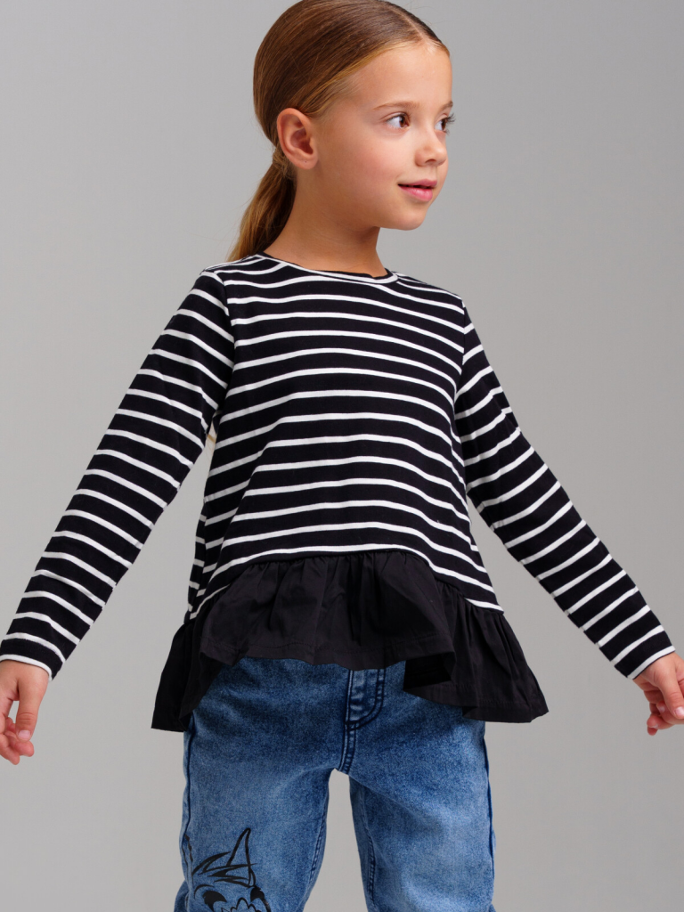 Футболка детская модная с длинным рукавом для девочки. Модель из качественного и приятного на ощупь трикотажа джерси. Лонгслив с высоким содержанием хлопка 95%. Благодаря наличию эластана в составе ткани изделие проще в уходе и держит форму. Модель из капсульной коллекции BLACK CHIC (БЛЭК ШИК). Соберите полный образ в едином стиле!
