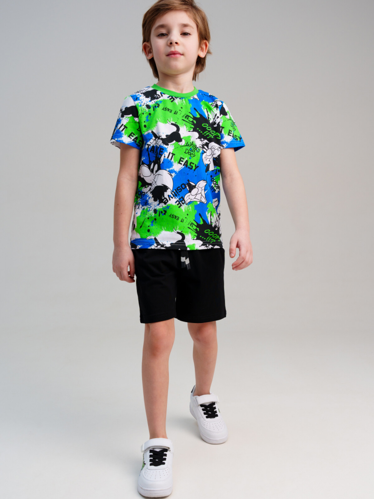 Футболка детская для мальчика. Высокое содержание хлопка. Благодаря наличию эластана в составе ткани изделие держит форму и меньше мнется. Модель выполнена из качественного и приятного на ощупь трикотажа.