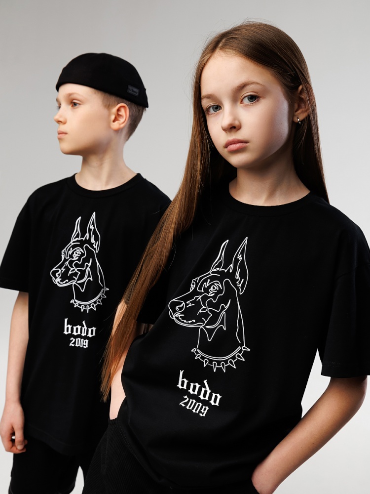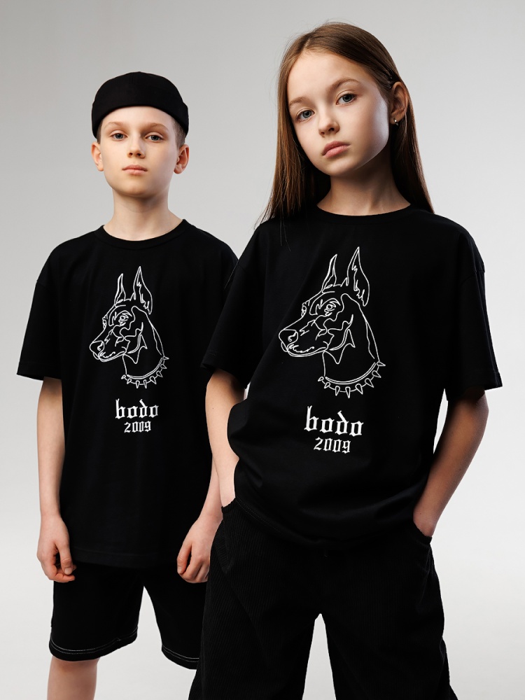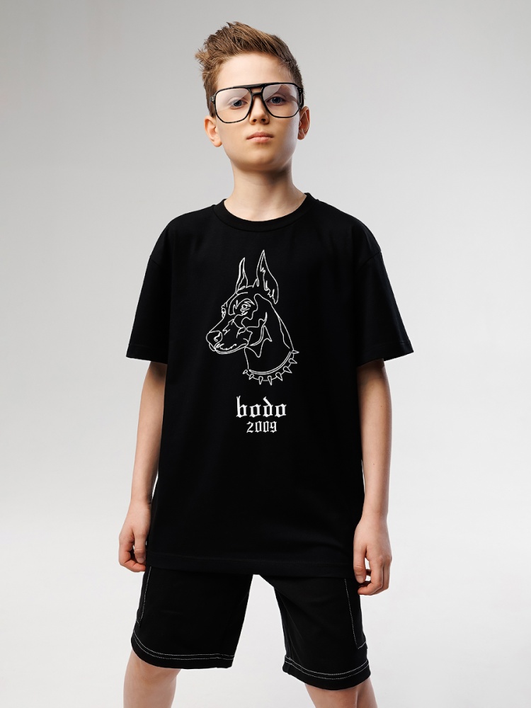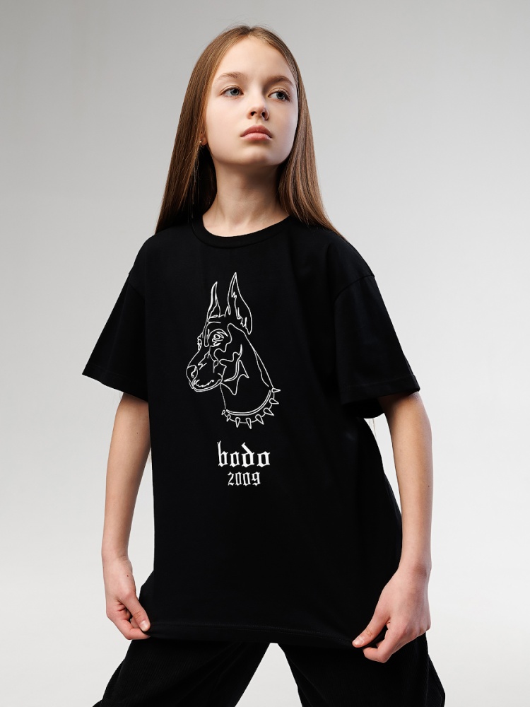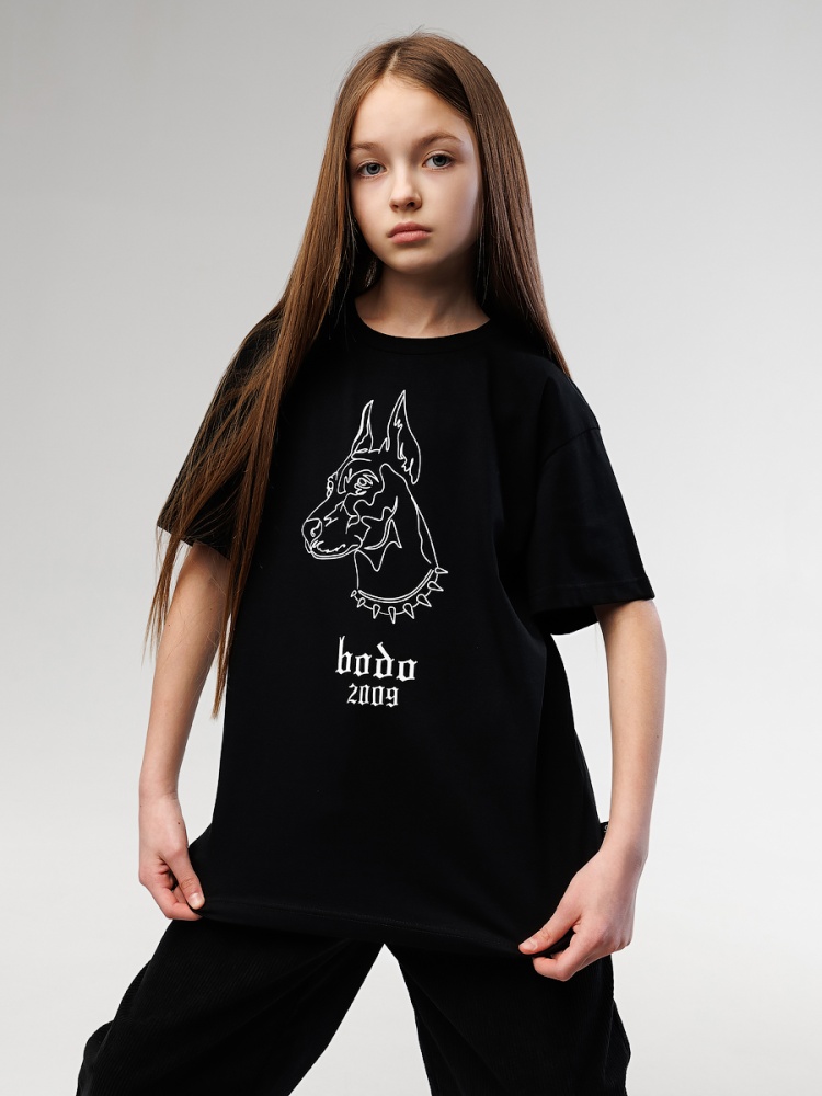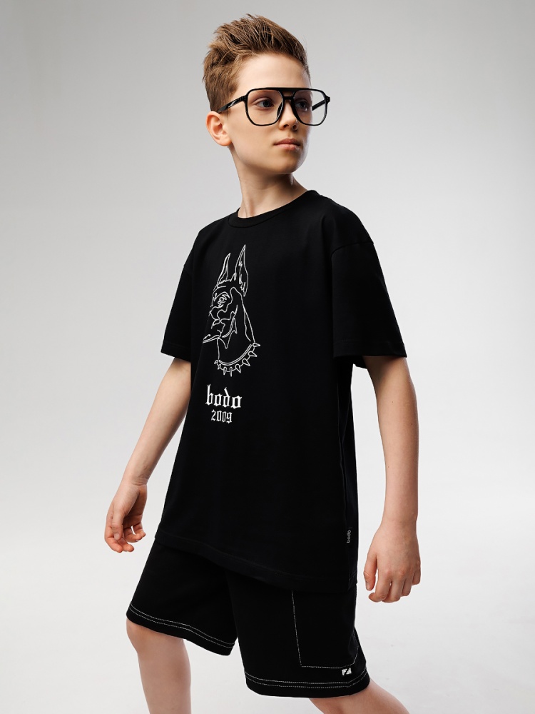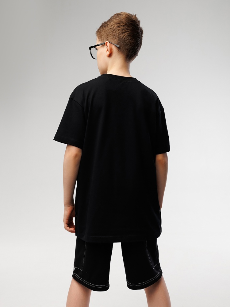 Футболка для детей школьного возраста. Футболка свободного силуэта с втачным коротким рукавом. Горловина футболки округлой формы. На полочке располагается принт.