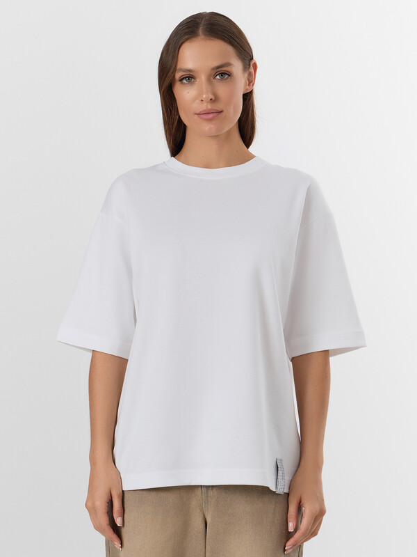 Белая футболка из линейки Premium Base — основа гардероба, где каждая деталь продумана для повседневного комфорта. Свободный силуэт со спущенным плечом и углубленной проймой обеспечивает свободу движений, не образуя складок в области подмышек. Мягкий интерлок с хлопком и полиэстером в составе сохраняет форму после стирок, не истончаясь и не теряя насыщенности белого цвета.