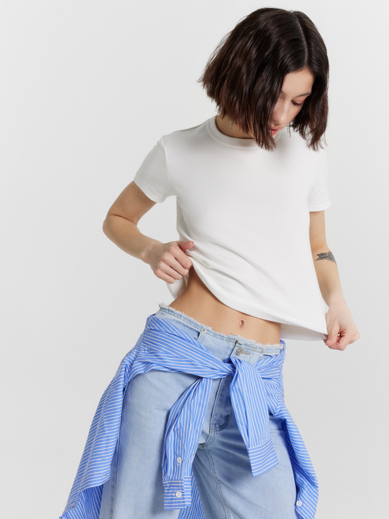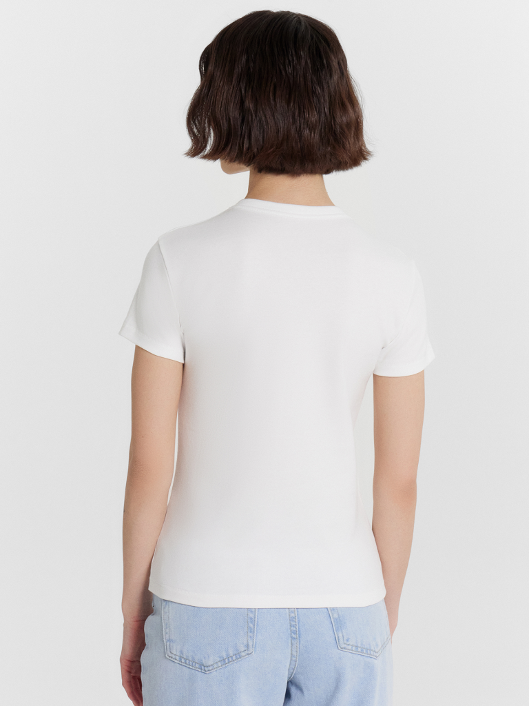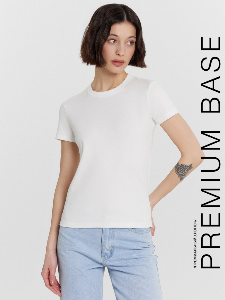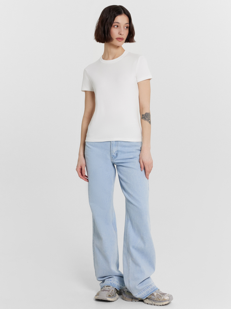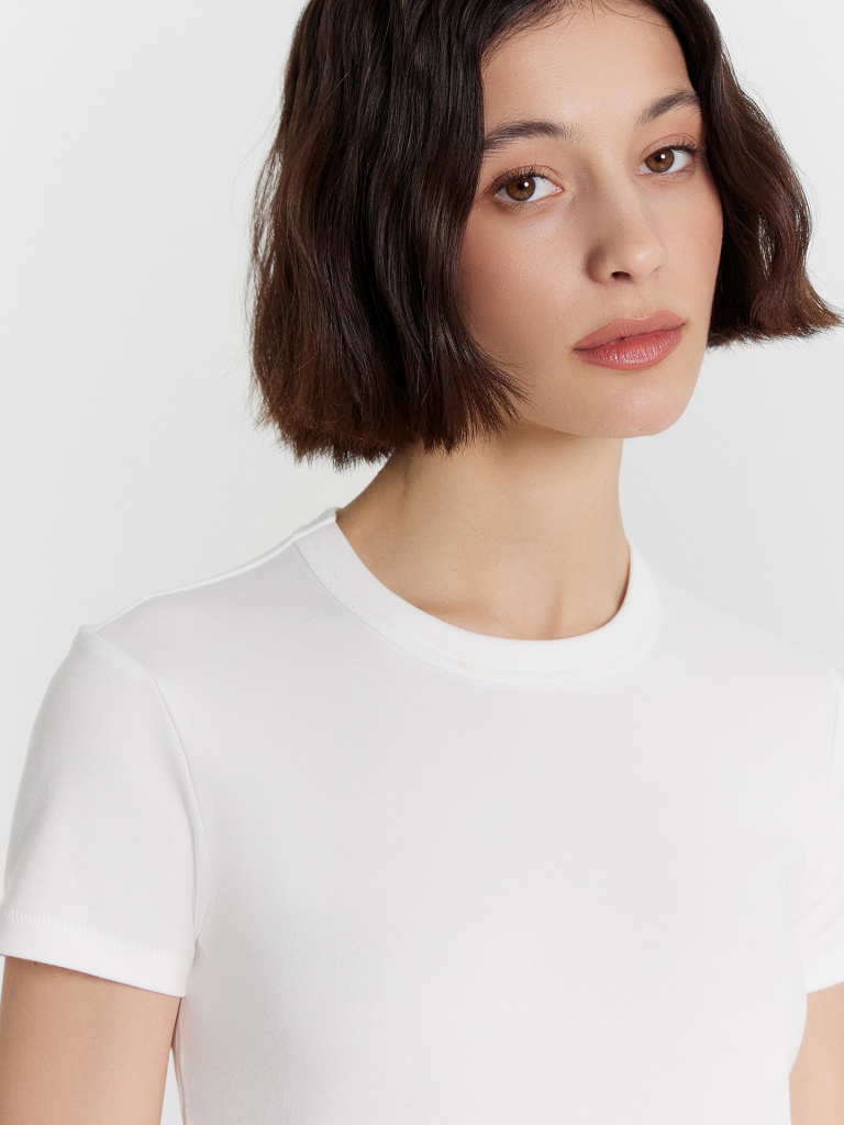 Нижние срезы футболки и рукавов обработаны швом вподгибку.
