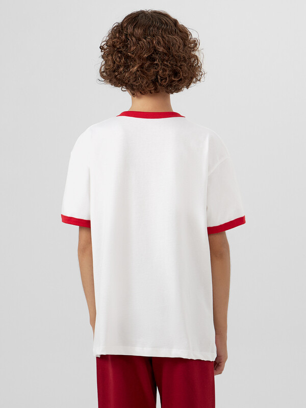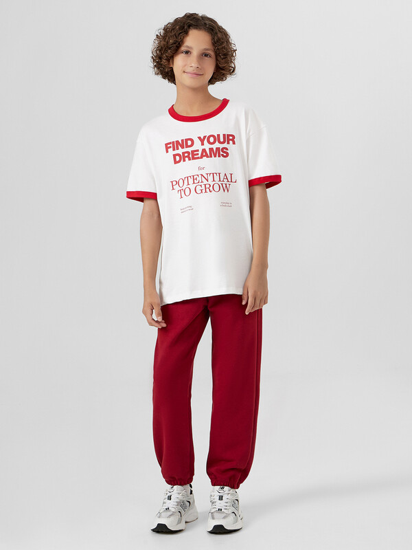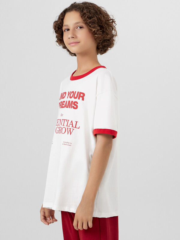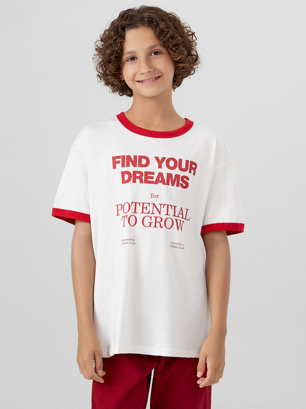 Джемпер для мальчиков свободного силуэта. Рукава втачные короткие. Горловина круглой формы. Горловина и низы рукава окантованы рибаной. Низ футболки обработан швом вподгибку на 2-ух игольной плоскошовной машине.