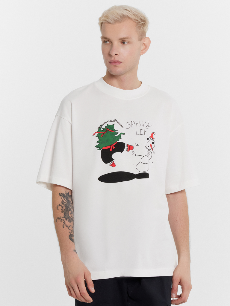 Ффутболка для мужчин из высококачественного хлопка. Модель с принтом в виде ёлки, снеговика и надписи «Spruce Lee». Длина до середины бедер, свободный прямой силуэт, горловина круглая, линия плеча немного спущена, рукава короткие. Обладает хорошей устойчивостью к выцветанию и отлично держит форму. Широкий размерный ряд. Рекомендуем!