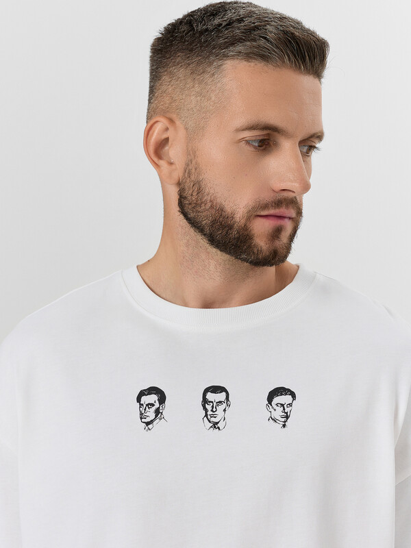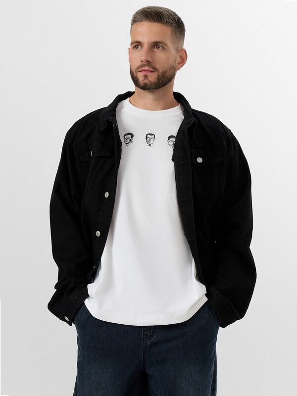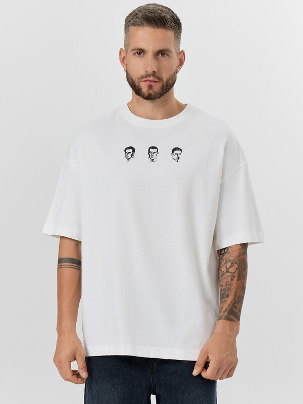 Футболка прямая свободная. Горловина округлой формы обработана обтачкой из рибаны. Линия плеча слегка спущена. Рукава втачные, корткие. Нижние срезы футболки и рукавов обработаны швом вподгибку на 2х шовной плоскошовной машине.