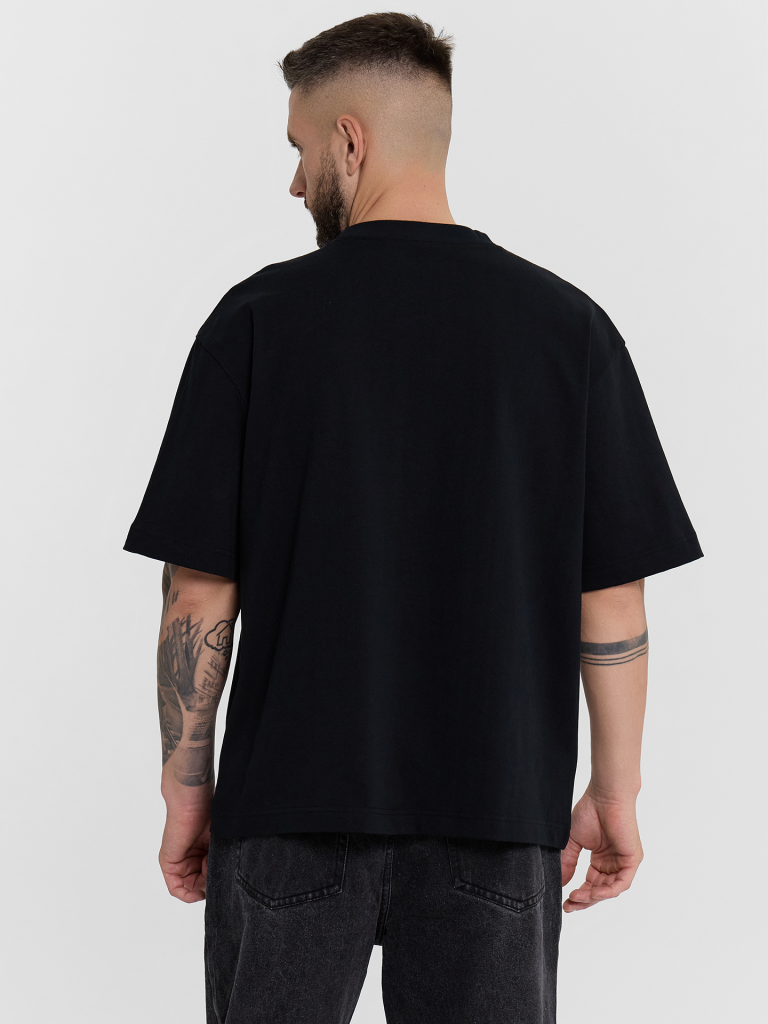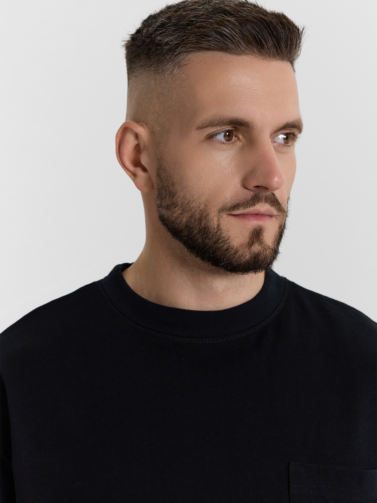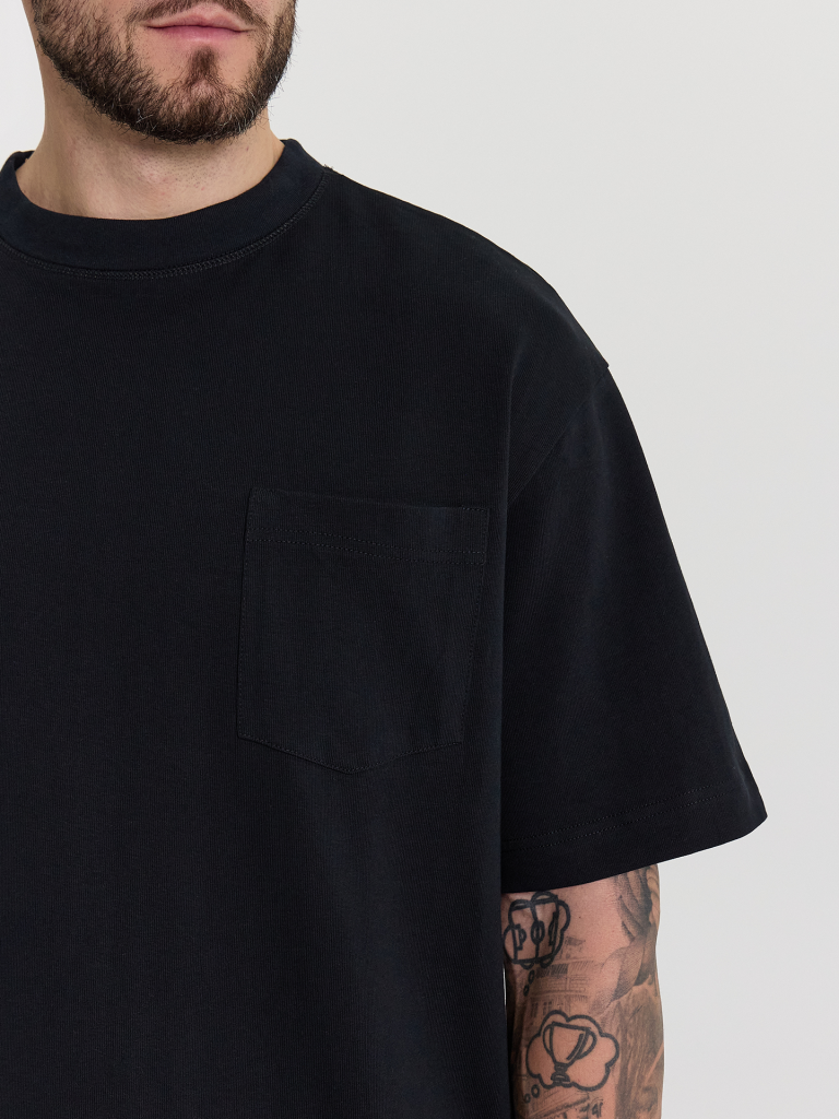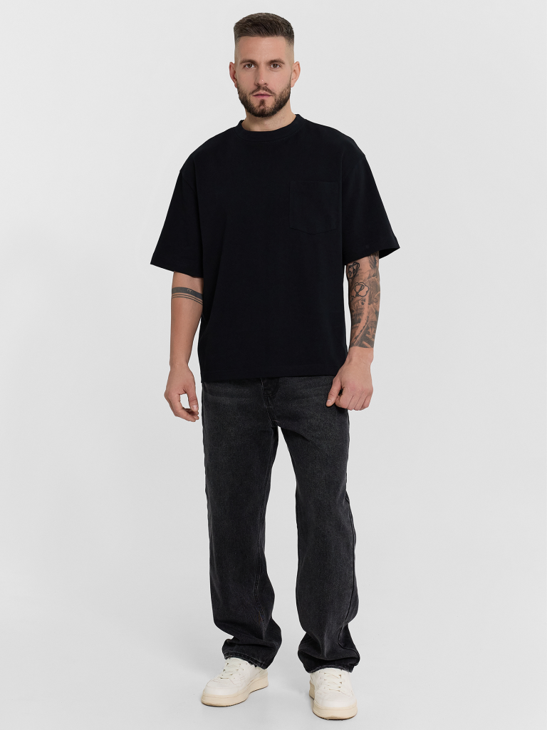 Футболка свободная укороченная, оверсайз. Горловина округлой формы обработана обтачкой из рибаны. Рукава втачные, корткие. Линия плеча спущена. На детали переда накладной карман (мод 111899-1). Нижние срезы футболки и рукавов обработаны швом вподгибку.