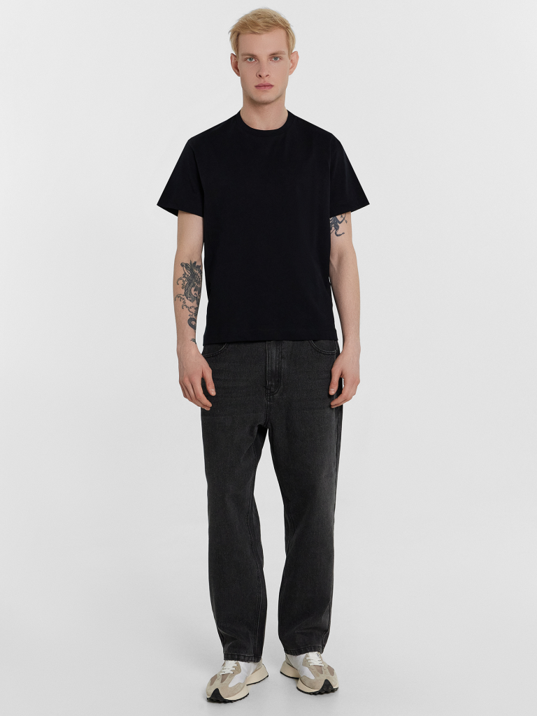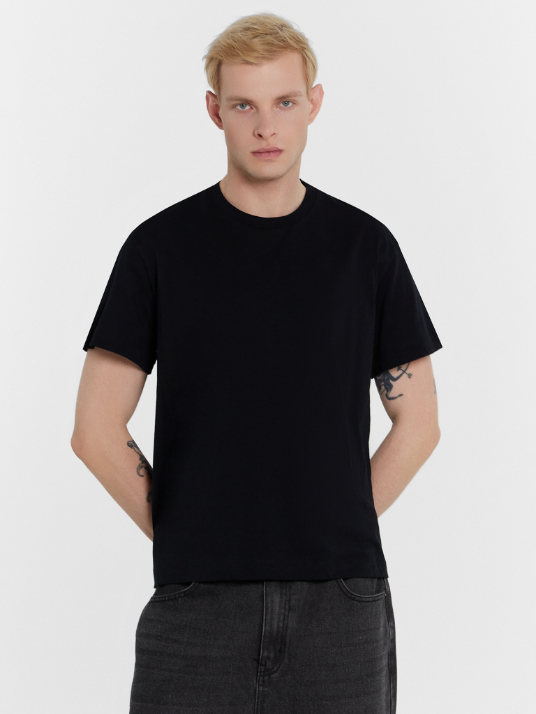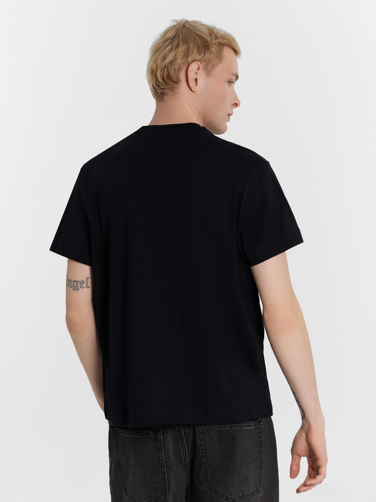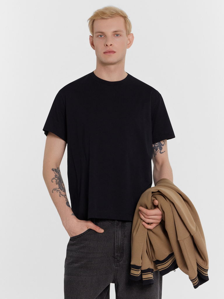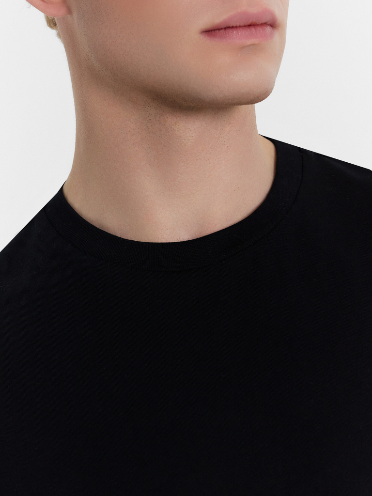 Нижние срезы футболки и рукавов обработаны швом вподгибку.