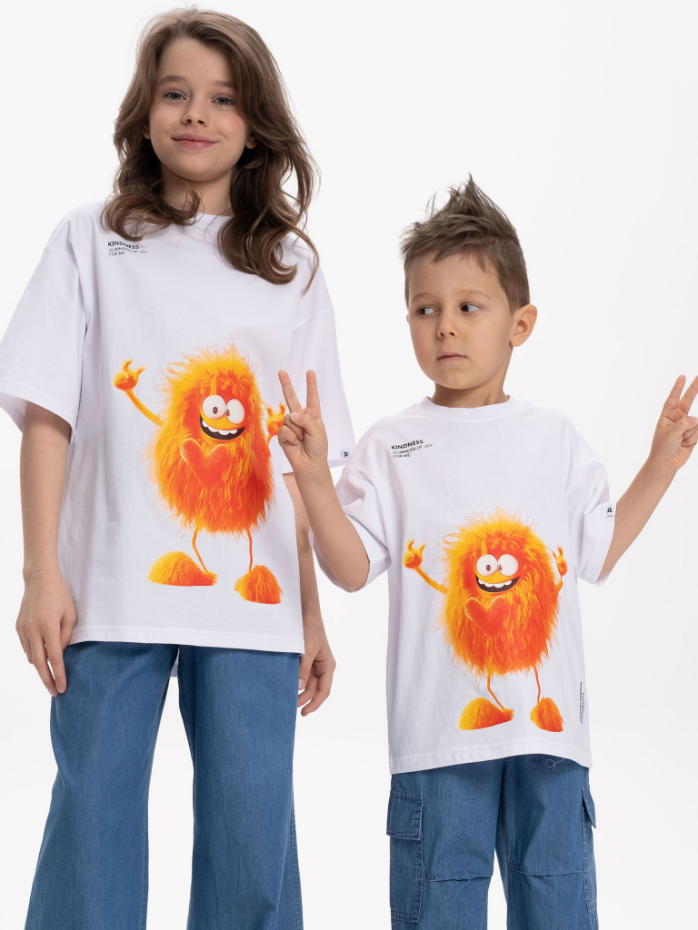 Детская футболка унисекс среднего объема. Прикольная нарядная футболка свободного силуэта со спущенным плечом не будет стеснять движений ребёнка. Вырез горловины отделан эластичной рибаной - голова не застрянет. Главная фишка футболки — яркий милый принт, изображающий персонажа, сгенерированного нейросетью (искусственным интеллектом). Это супермодный тренд! Принт эластичный и стойкий — без проблем переносит многочисленные стирки, не теряя своей яркости. На принте изображён забавный пушистый чудик (монстрик) оранжевого цвета + надписи "доброта", "искры радости для меня" и "создано с помощью искусственного интеллекта". Широкая размерная сетка позволяет приобрести такую футболку как малышу в детский садик так и подростку. . Белые футболки подходят для носки летом, осенью и весной (демисезон), а также зимой . Цвет товара на экране вашего устройства может отличаться от цвета изделия вживую.
