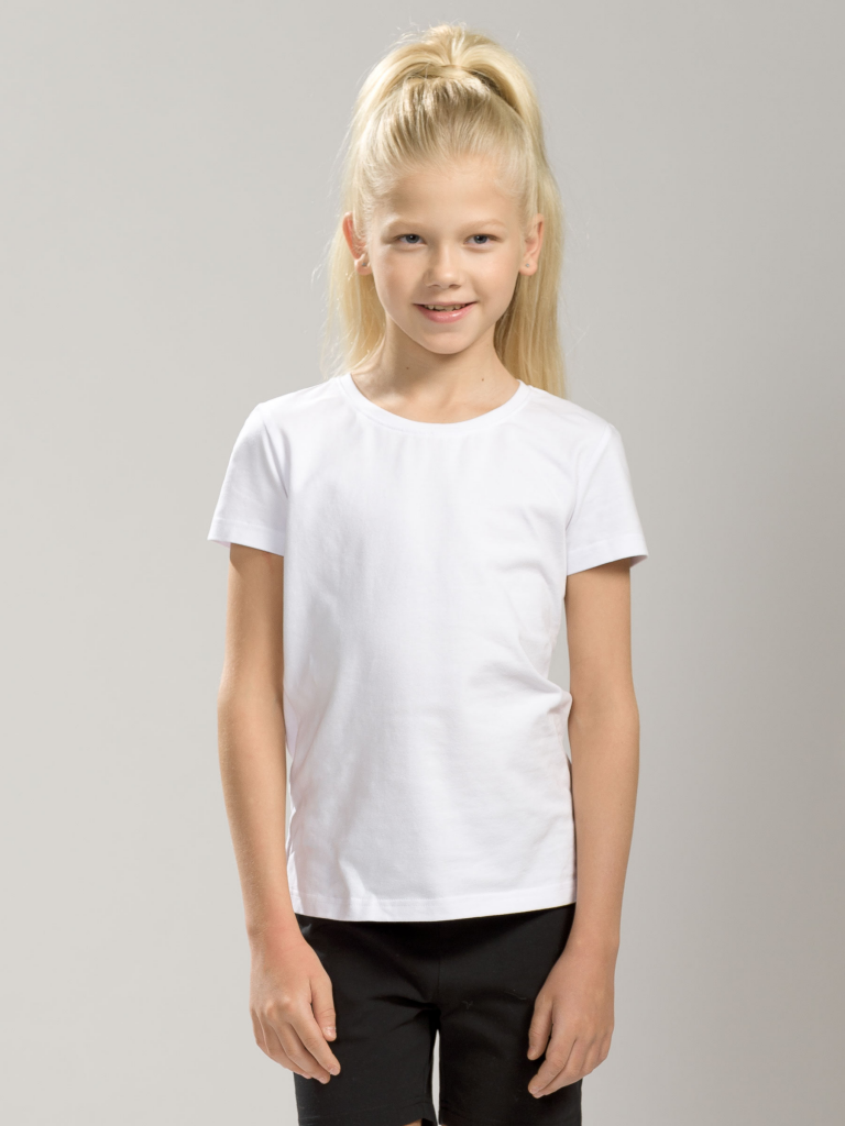 Базовая футболка белого цвета для девочки. Натуральный хлопок в составе позволяет телу дышать, ткань мягкая, приятная на ощупь, не боится частых стирок. Свободная посадка и классический крой – комфорт каждый день и бесчисленные варианты для составления образов. Прекрасно комбинируется с пиджаком, сарафаном, джинсами, лосинами, брюками, шортами. Незаменима в школьном гардеробе.