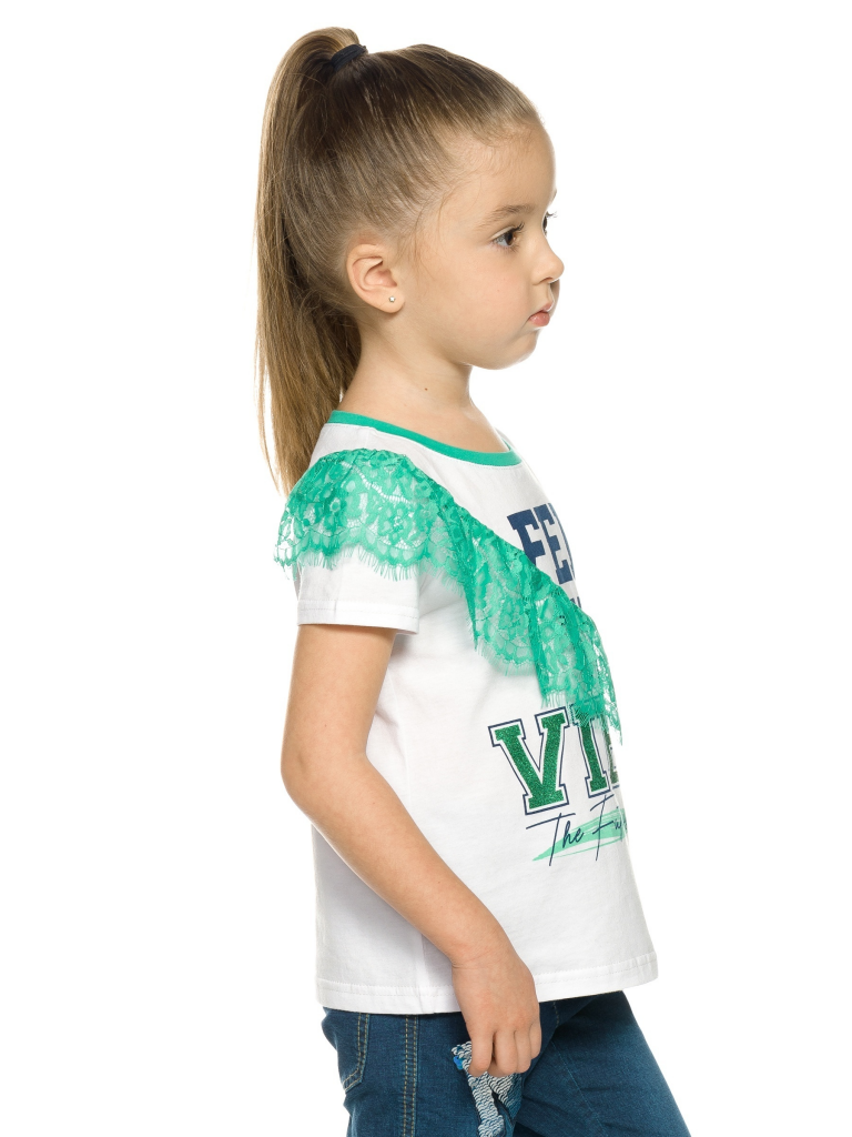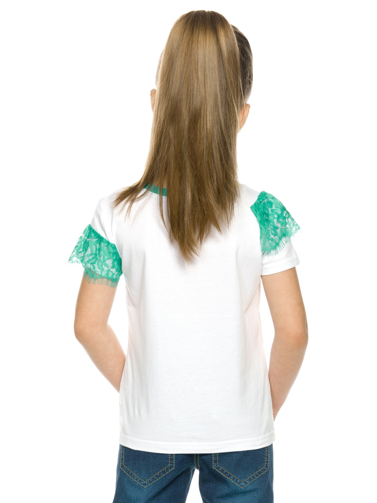 Футболка умеренного объёма с втачным рукавом. Стиль деконструктивизм выражается декором из контрастного мягкого кружева по правой стороне изделия и левому рукаву. Шрифтовая композиция с разноцветным глиттером, перевод Почувствуй настроение. Будущее блестяще .