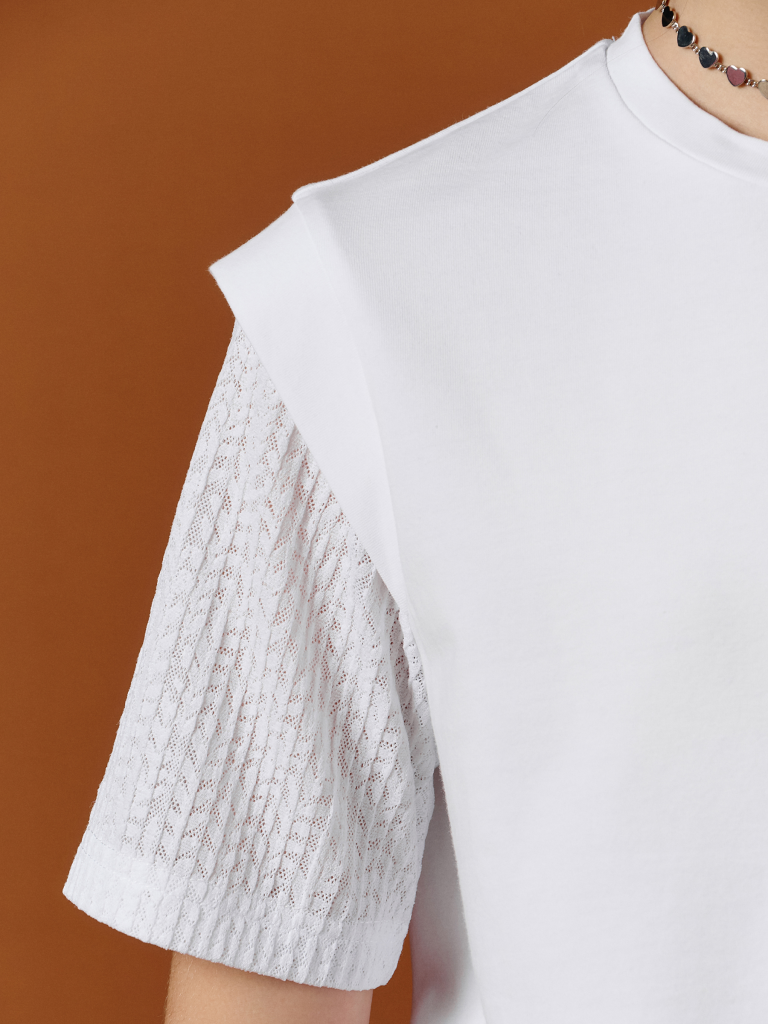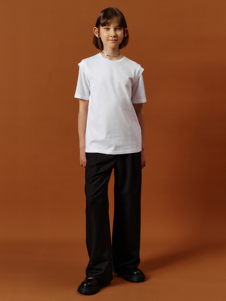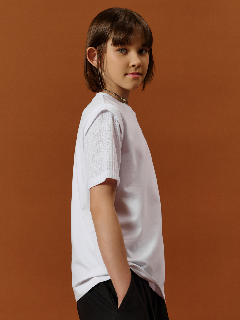 Эта футболка станет настоящей находкой для школьного гардероба! Выполнена из приятного к телу хлопкового трикотажа с добавлением эластана — материал дышащий, мягкий и слегка тянется, обеспечивая комфорт в течение всего дня. Особенности дизайна: Короткие рукава из нежного кружева с рельефным горизонтальным узором придают образу лёгкость и утончённость. Кружево абсолютно не колется и не раздражает кожу, благодаря качественному материалу и продуманной обработке швов. Полуприлегающий силуэт красиво садится по фигуре, не стесняя движений. Эффектные крылышки на плечах из основной ткани добавляют нарядности и игривого настроения. Удобство и универсальность: Идеалена для школы, праздников, фотосессий или семейных встреч. Легко сочетается с юбками, брюками и сарафанами. Проста в уходе: не требует особых условий при стирке, сохраняет форму и внешний вид после многократного использования. Эта футболка — отличный выбор для тех, кто ценит комфорт и хочет выглядеть красиво каждый день. Используйте таблицу размеров на фотографии, чтобы выбрать подходящий размер. Обратите внимание, что цвет товара на экране вашего устройства может отличаться от реального.
