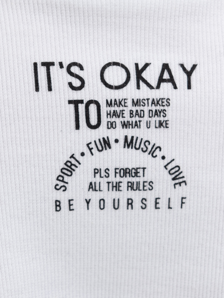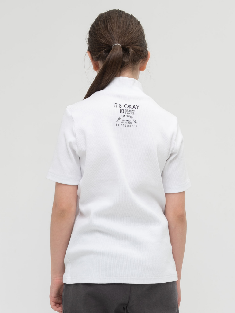 Футболка в школу из нежного, мягкого материала кашкорсе. Стиль: унисекс. Высокая горловина стойка и рукав не сильно обтягивают и дают свободу движений. Текстовый принт на спине переводится как: Это нормально: Совершать ошибки, Иметь плохие дни, Делать то, что тебе нравится. Спорт веселье музыка – любовь. Пожалуйста, забудь все правила. Будь собой. Он привлекает внимание и создает настроение. Можно носить с любым верхом и в качестве самостоятельного предмета одежды. Удобная не только для школы, но и для прогулок, встреч с друзьями.