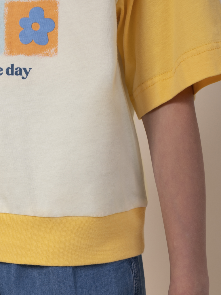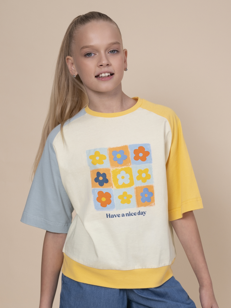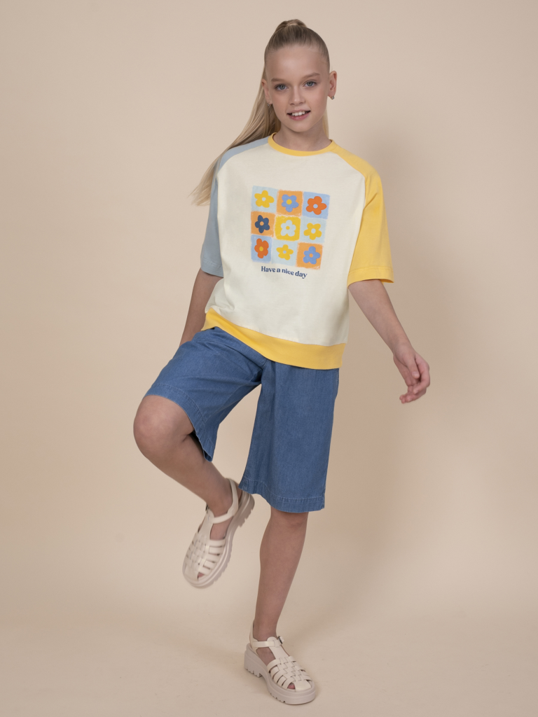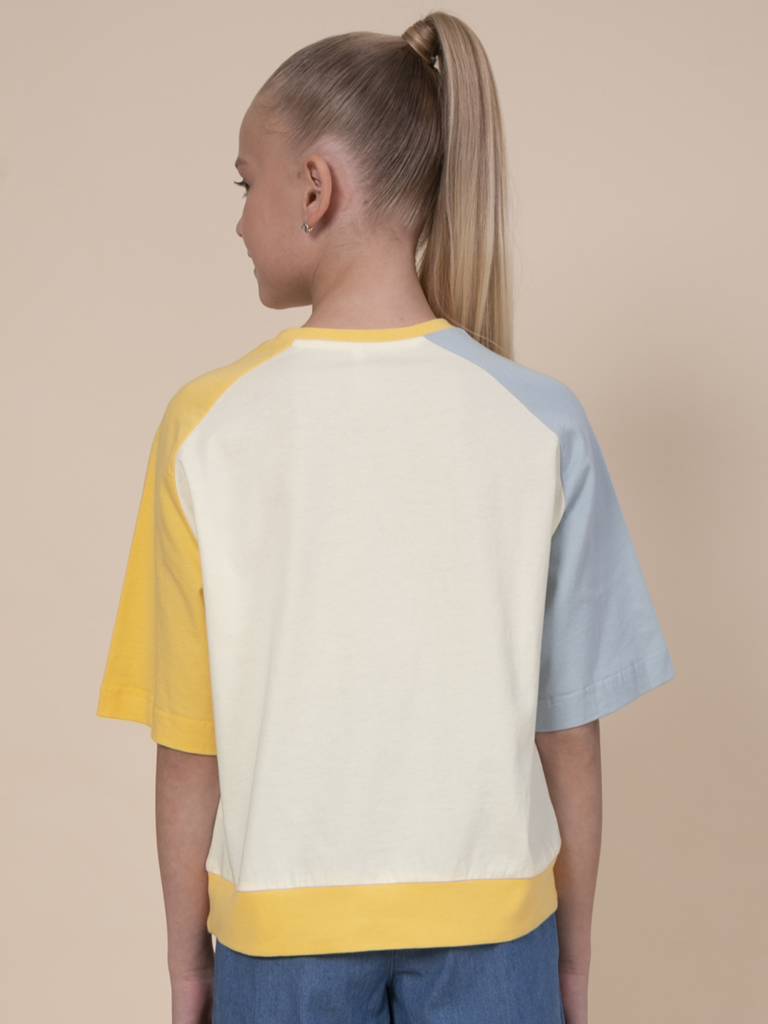 Укороченная футболка для девочки с коротким рукавом-реглан. Футболка свободного прямого кроя и актуальный оверсайз силуэт делают детский джемпер невероятно модным и удобным. Яркая и стильная вещь с принтом охладит в жаркую погоду пропуская воздух. Можно надевать под ветровку как весенний вариант, под тонкую жилетку как летний или в качестве самостоятельного элемента гардероба девочек для создания многослойного образа. Объемная укороченная кофта самая уютная вещь на весну и на лето. Базовая вещь в гардеробе стильного малыша. Благодаря уникальному крою, комфортно подойдет для любой фигуры девушки, для высоких и невысоких детей. Мягкая трикотажная блузка подойдет на улицу для прогулок, отдыха на природе, путешествий, посещение кружков и секций, на танцы и хип-хопа, занятия спортом, как домашняя одежда для дома и повседневный вариант. Станет самой любимым и востребованным в гардеробе ребенка. Размерная линейка: 1 (86): 2 (92): 3 (98): 4 (104): 5 (110): 6 (116): 7 (122): 8 (128): 9 (134): 10 (140): 11 (146). Выбирайте нужный размер по таблице размеров на фото. Цвет товара на экране вашего устройства может отличаться от цвета изделия вживую.