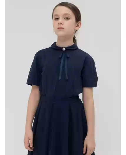 Школьная футболка из хлопкового трикотажа. Мягкая, комфортная ткань хорошо держит форму и не растягивается. Эластичное кружево по рукаву, круглый воротник с бантом из репсовых и кружевных лент, закрепленный пуговицей с жемчужиной и стразами стильные фишки этой модели. Удобная застёжка сзади воротника позволит легко надеть джемпер и не испортить причёску. Эта красивая практичная футболка станет любимой в гардеробе юной модницы.