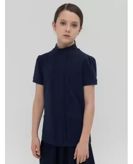 Школьная футболка для девочки из хлопкового трикотажа. Мягкая ткань хорошо пропускает воздух, не электризуется. Кружево по бокам центральной складки спереди и по воротнику, а также лёгкая сборка рукава вносят немного романтики в классический стиль. Практична в повседневной носке, не растягивается и не теряет цвет после стирок.