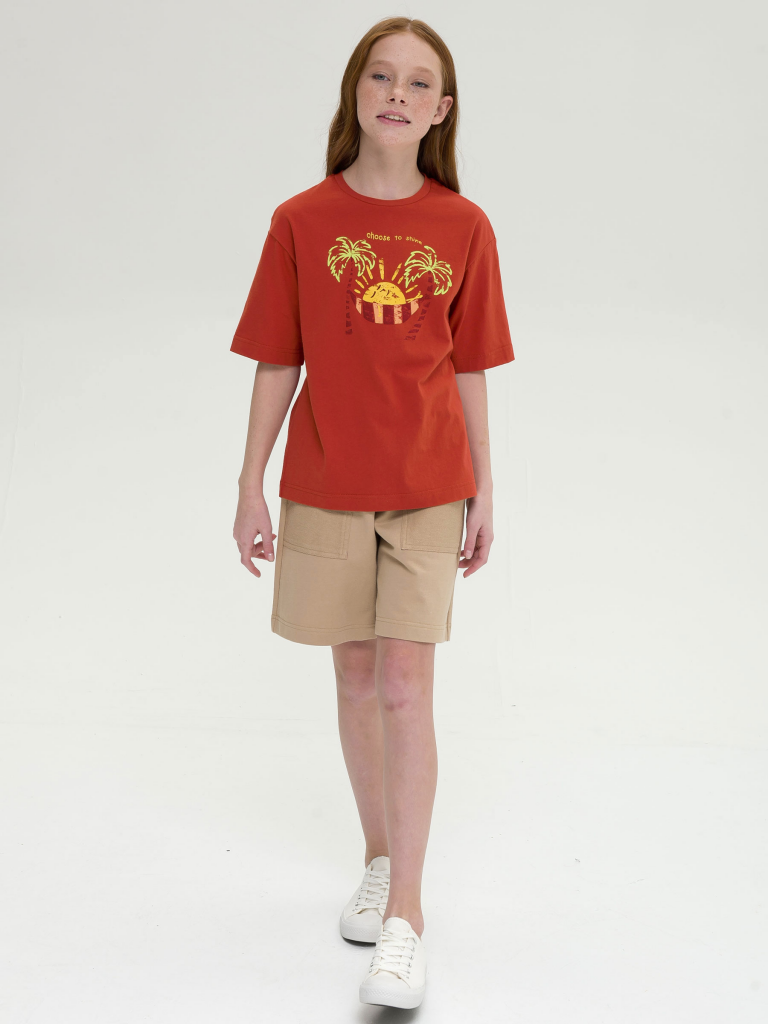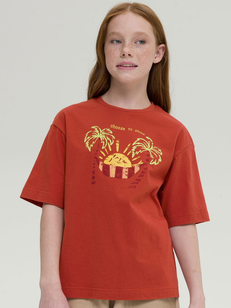 Футболка из тонкого трикотажа для девочки. 100% хлопок в составе – ткань мягкая, легкая, дышащая, приятная на ощупь. Яркий эмоциональный принт для улыбки и настроения на целый день. Футболка отлично подходит для создания стильного образа весной и летом в паре с джоггерами или шортами. Идеальна для повседневного стильного образа весной и летом, для отдыха и занятия спортом.