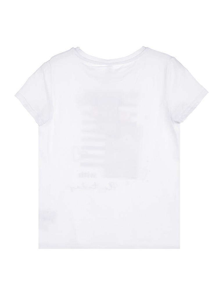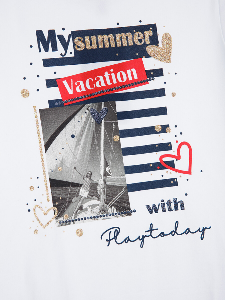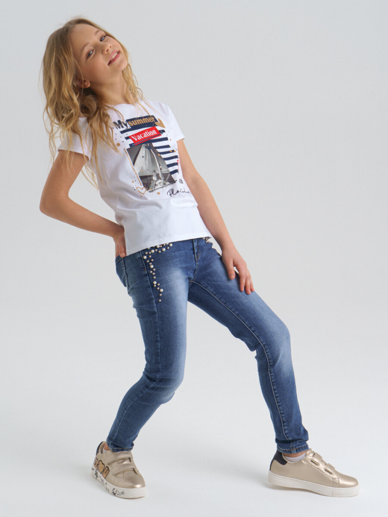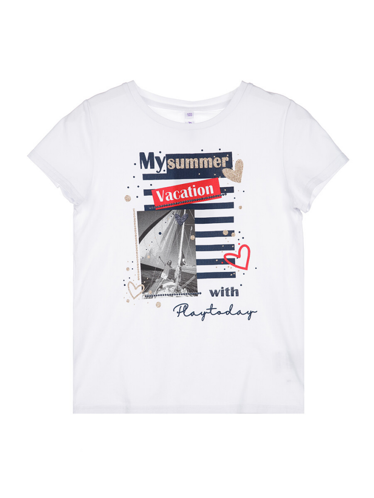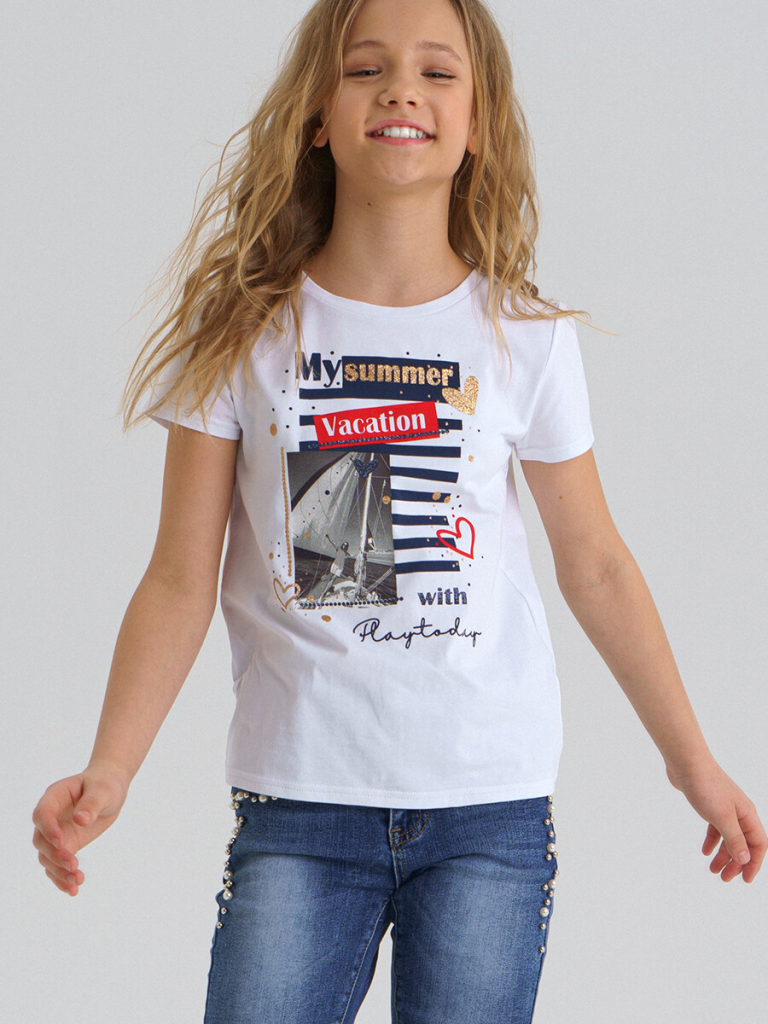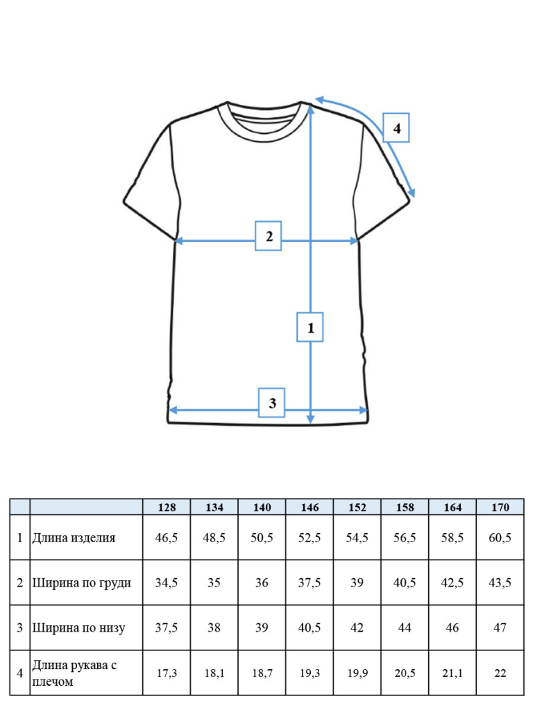 Футболка из качественного приятного на ощупь трикотажа. Размер изделия на фото - 140, параметры модели (см): рост 143, обхват груди-талии-бедер: 69-58-78. Высокое содержание хлопка 95%. Благодаря наличию эластана в составе ткани, изделие проще в уходе и держит форму.