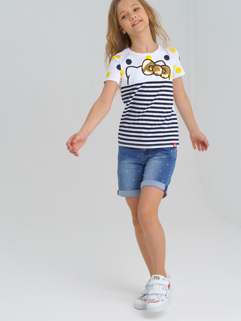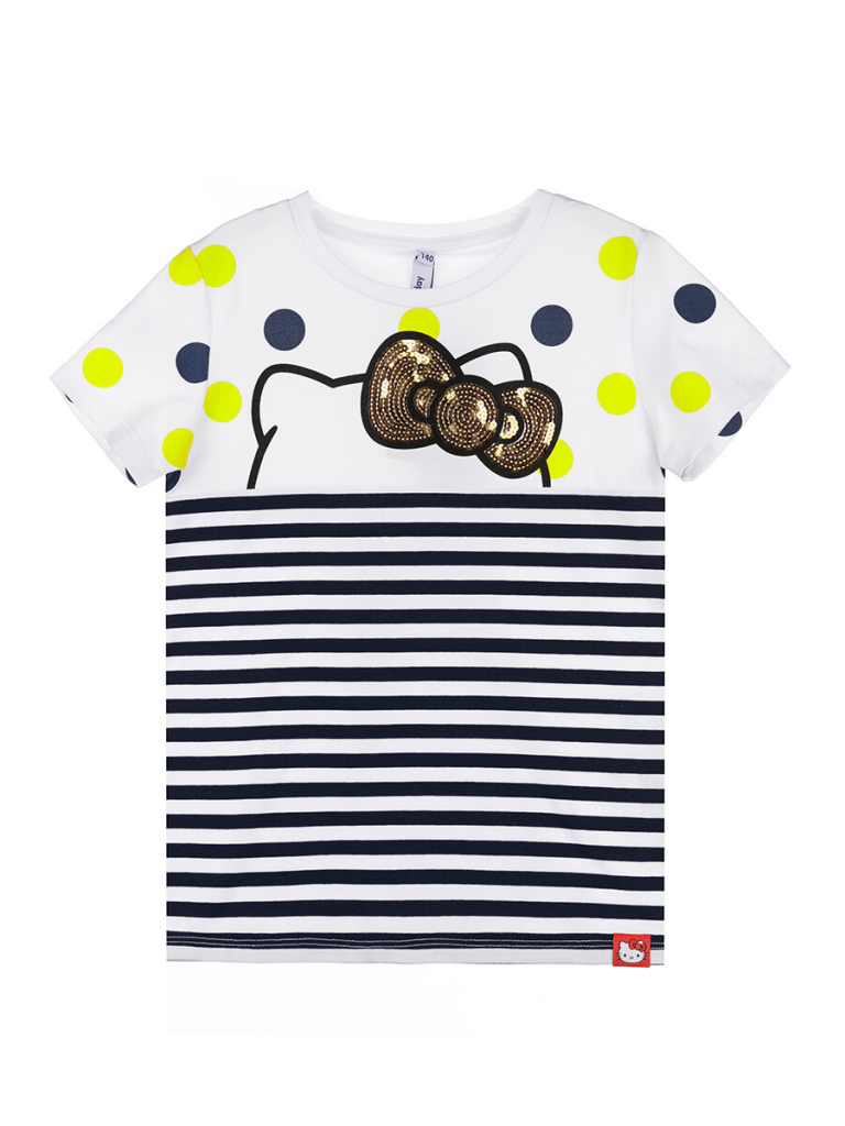 Футболка с принтом Hello Kitty из качественного приятного на ощупь трикотажа. Высокое содержание хлопка 95%. Благодаря наличию эластана в составе ткани, изделие проще в уходе и держит форму.