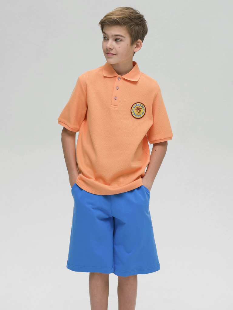 Футболка-поло из 100% хлопка для мальчика. Модель выполнена из трикотажного полотна актуальной "вафельной" фактуры. Такая ткань неприхотлива в уходе, а также она мягкая и очень приятная на ощупь. Благодаря этому ваш ребёнок будет чувствовать себя комфортно. У горловины планка с пуговицами — изделие удобно надевать и снимать. Поло среднего объёма можно сочетать как с шортами, так и с брюками. С такой футболкой легко создать стильный образ для мальчика. Изюминка модели — жаккардовая нашивка с принтом.