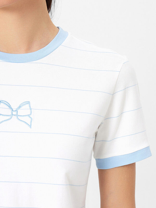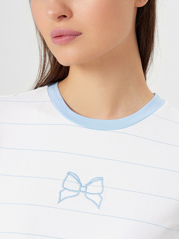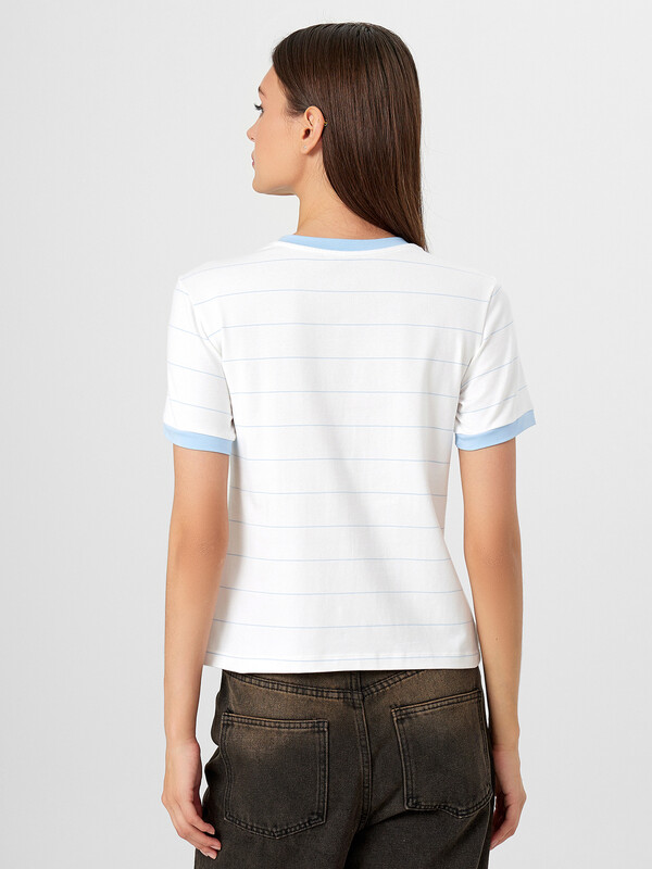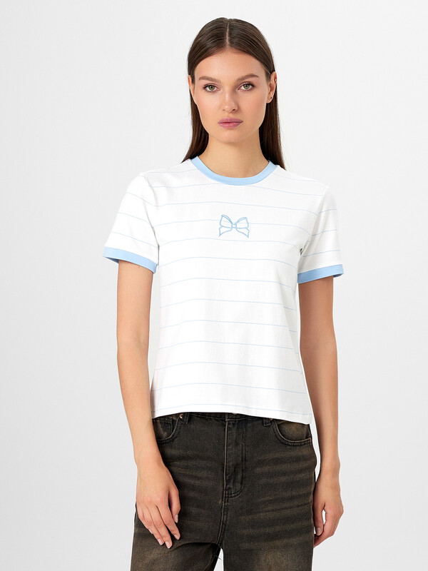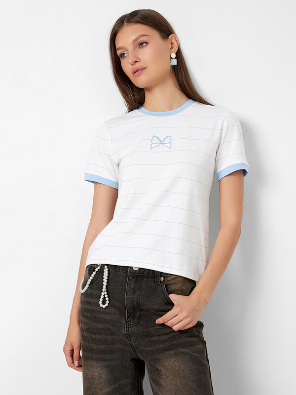 Женская укороченная футболка прилегающего силуэта — это стильная и универсальная модель, которая подчеркивает фигуру и отлично вписывается в повседневный гардероб. Благодаря добавлению эластичных волокон к хлопковой основе, изделие сохраняет форму, мягко облегает тело и обеспечивает комфорт при движении. Круглая горловина с обтачкой из основного полотна создаёт аккуратный и лаконичный образ, а короткие рукава с манжетами добавляют спортивной динамики и подчеркивают актуальность модели. Укороченная длина делает футболку идеальной для сочетания с брюками и юбками с высокой посадкой, создавая стильные и сбалансированные силуэты. Нижний срез аккуратно обработан швом вподгибку, что придает изделию завершенный и опрятный вид. Такая футболка подойдет как для повседневных образов, так и для более выразительных сочетаний с акцентными аксессуарами.