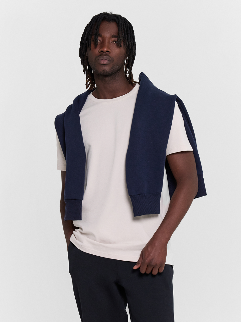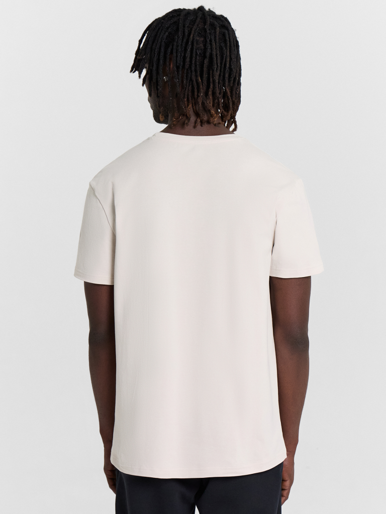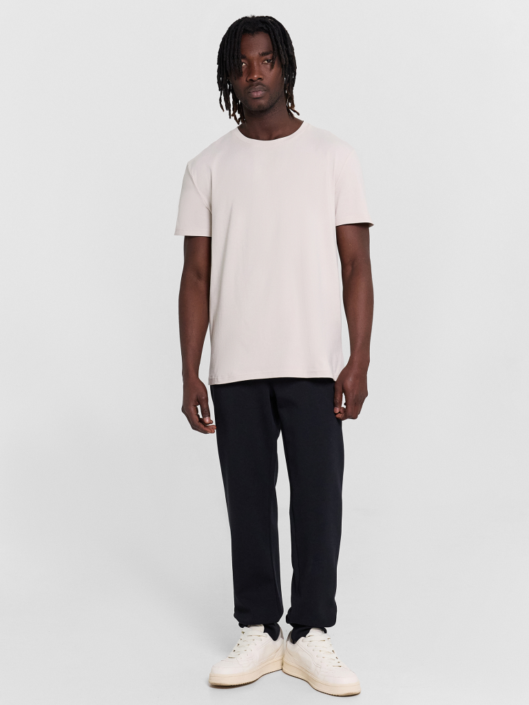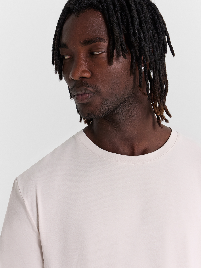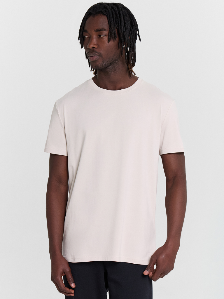 Футболка облегающего силуэта. Перед и спинка цельнокроеные. Горловина круглой формы. Обтачка горловины из основного полотна. Горловина спинки закрыта бейкой из основного полотна. Рукав втачной, короткий. Низ изделия и рукавов обработан швом вподгибку.