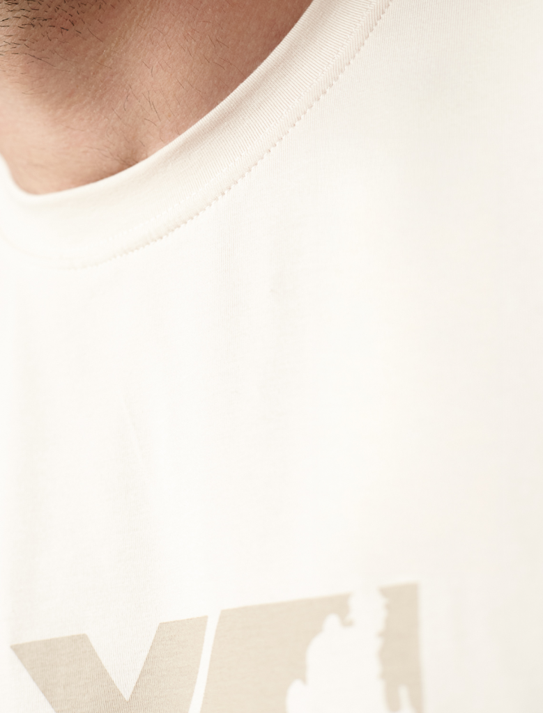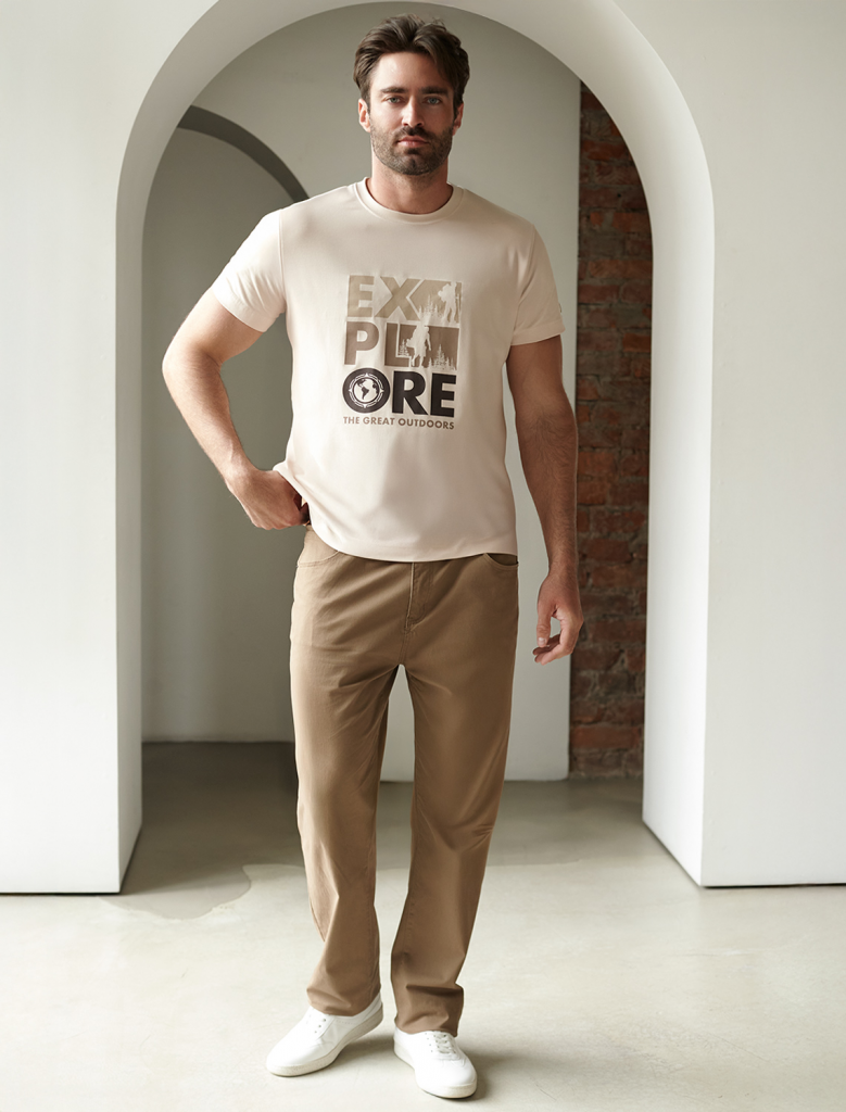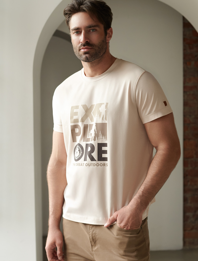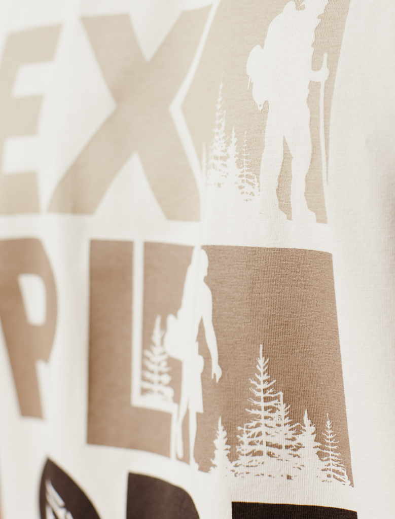 Перевод принта: Explore the great outdoors - исследуй мир. Футболка выполнена из премиального хлопка с эластаном. Авторский принт нанесен фактурными красками с устойчивым покрытием. Изделие комфортно сидит по фигуре, не сковывая движений. За счет среднего объема, хорошо подойдет как первый слой под пиджак, кардиган или бомбер. На рукаве нашивка из эко-кожи с логотипом бренда.
