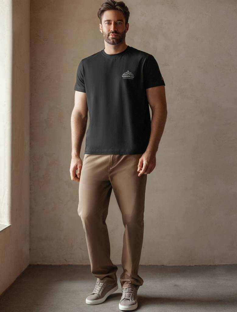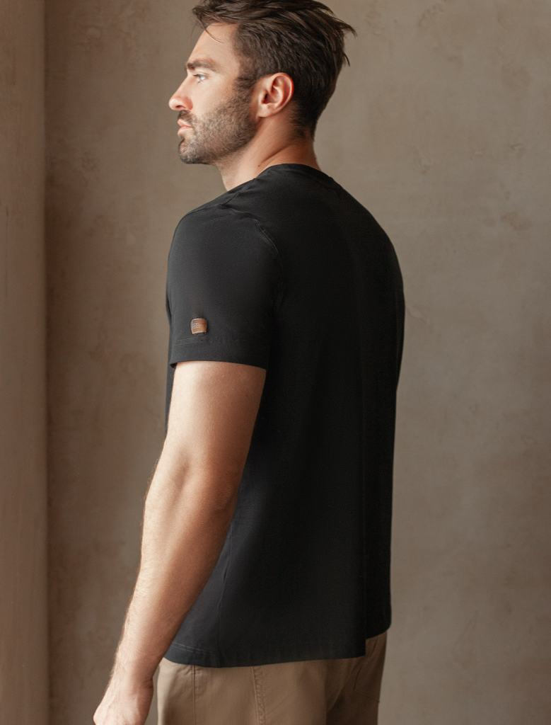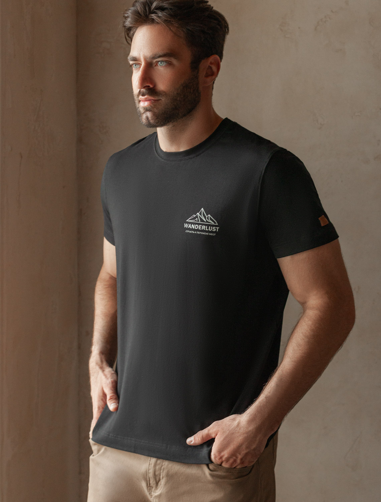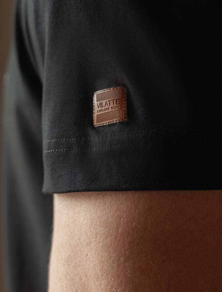 Футболка выполнена из премиального хлопка с эластаном. Авторский принт нанесен фактурными красками с устойчивым покрытием. Изделие комфортно сидит по фигуре, не сковывая движений. За счет среднего объема, хорошо подойдет как первый слой под пиджак, кардиган или бомбер. На рукаве нашивка из эко-кожи с логотипом бренда.