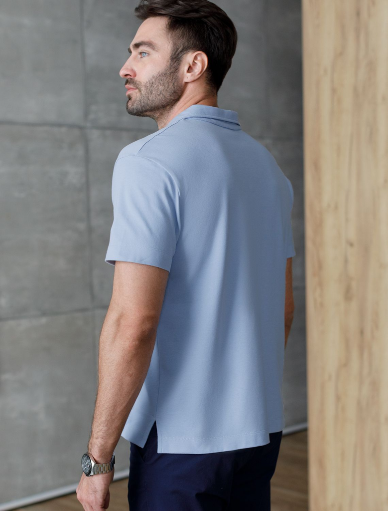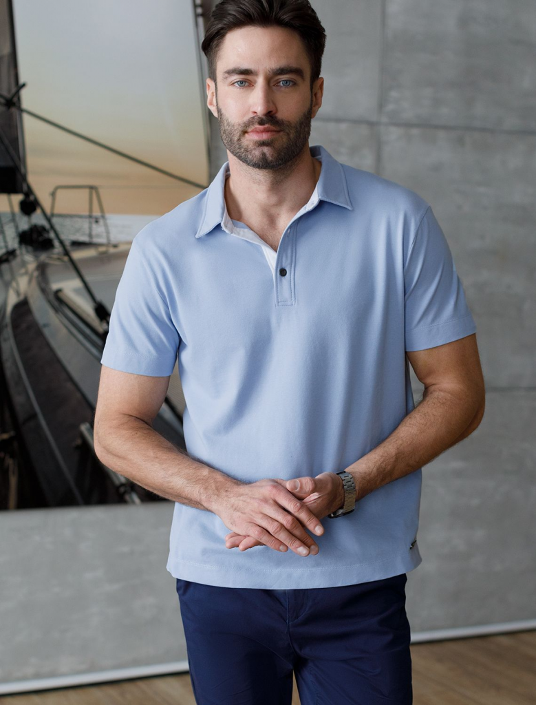 Поло выполнено из фактурного хлопка, которое обеспечивает комфорт даже в жаркое время года и почти не мнется. Контрастная планка застегивается на матовые серебряные пуговицы с логотипом бренда. Преимущество изделия — это добавление эластана в классический для поло материал «пике», что гарантирует безупречный комфорт и долговечность. Поло сочетается в паре со светлым денимом и чиносами, в офис с черными брюками.